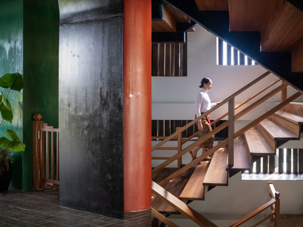 หรือแม้แต่รายละเอียดในส่วนของบันได ที่เป็นทั้งวิถีชีวิตในแบบบ้านสไตล์ชิโนโปตุกีสและภูมิปัญญาการก่อสร้าง ที่โดยปกติแล้วบ้านสไตล์ชิโนโปตุกีสมักจะพบเห็นเป็นบันไดไม้ และนิยมก่อปูนขึ้นมา 3-4 ขั้น เพื่อให้จบกับพื้นและรองรับโครงสร้างของบันได ซึ่งส่วนนี้อาจไม่ได้มีการถูกบันทึกไว้แต่เป็นการพบเห็นตามวัฒนธรรมที่ทางผู้ออกแบบก็นำมาเพิ่มกลิ่นอายของบ้านชิโนโปตุกีสด้วย รวมถึงส่วนของเพดานที่ทางผู้ออกแบบก็เลือกที่จะเปลือยโชว์ความดิบ เพราะสามารถลงรอยกับการออกแบบส่วนอื่นและสื่อสารเรื่องราวของวัฒนธรรมได้อย่างตรงไปตรงมามากกว่า