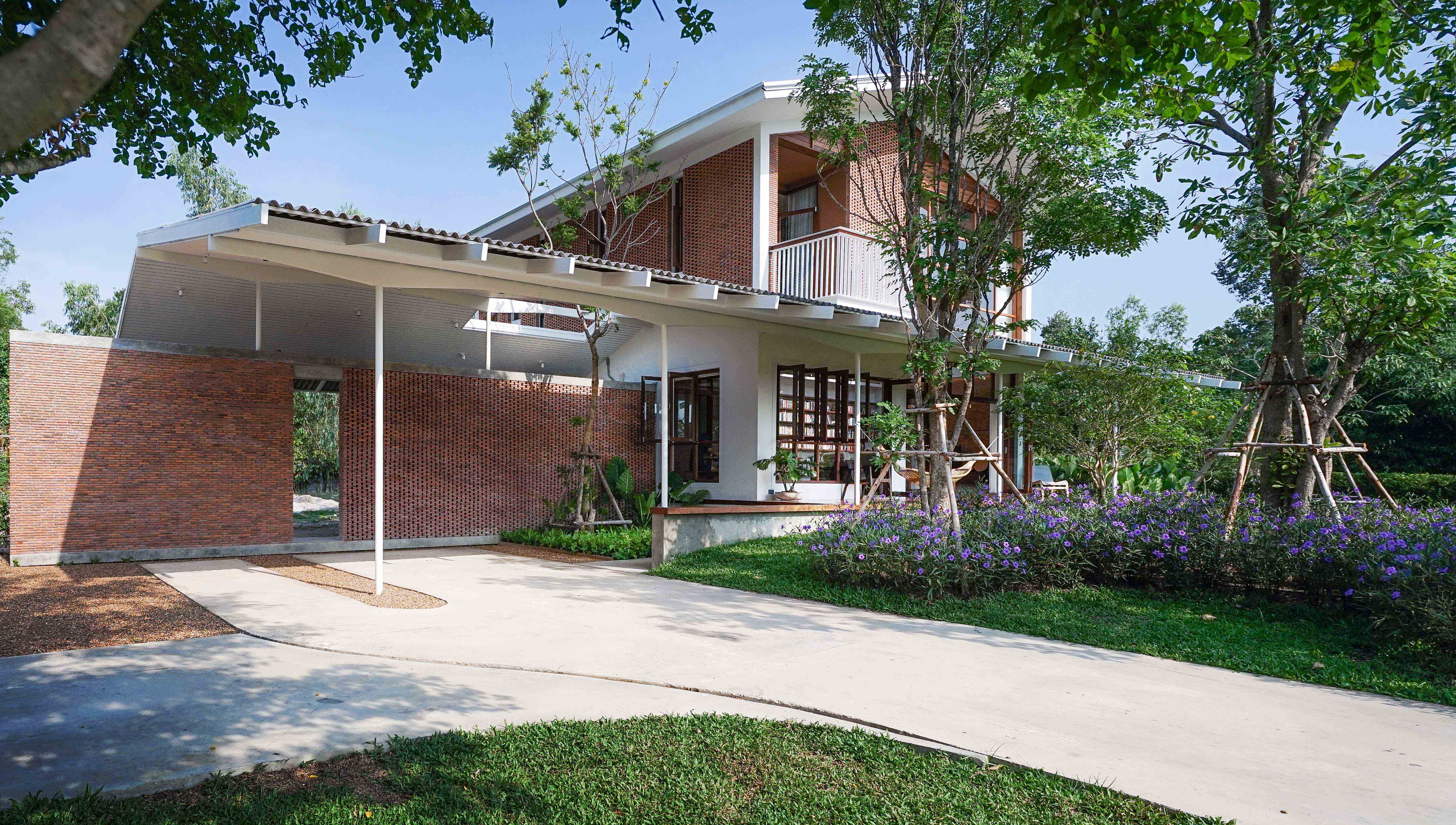 ผนังภายนอกที่ก่ออิฐเว้นร่องเพื่อโชว์ความสวยงามของ Pocket Garden ในระเบียงห้องนอนชั้นสอง