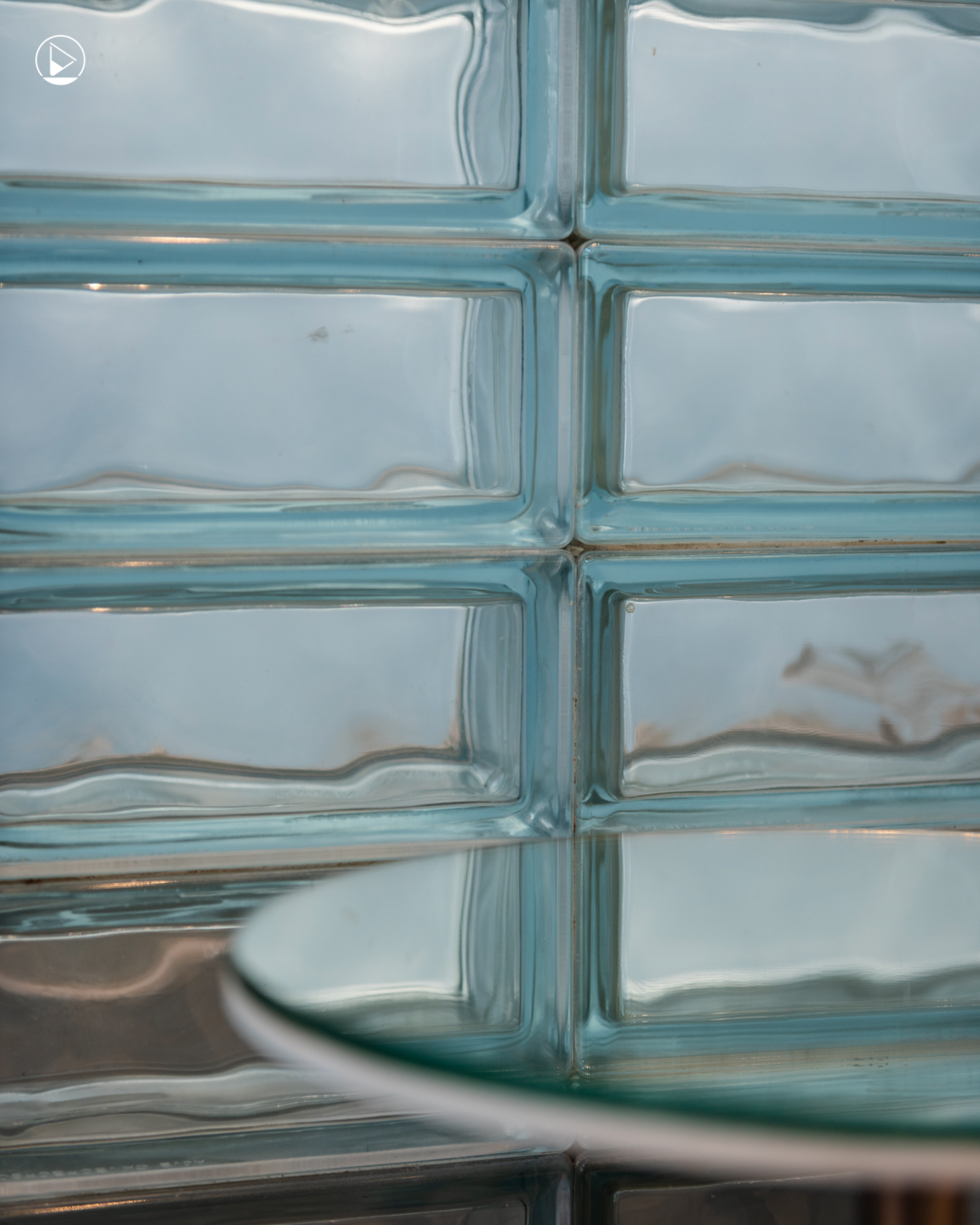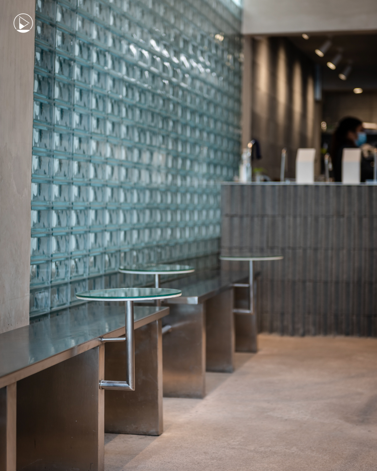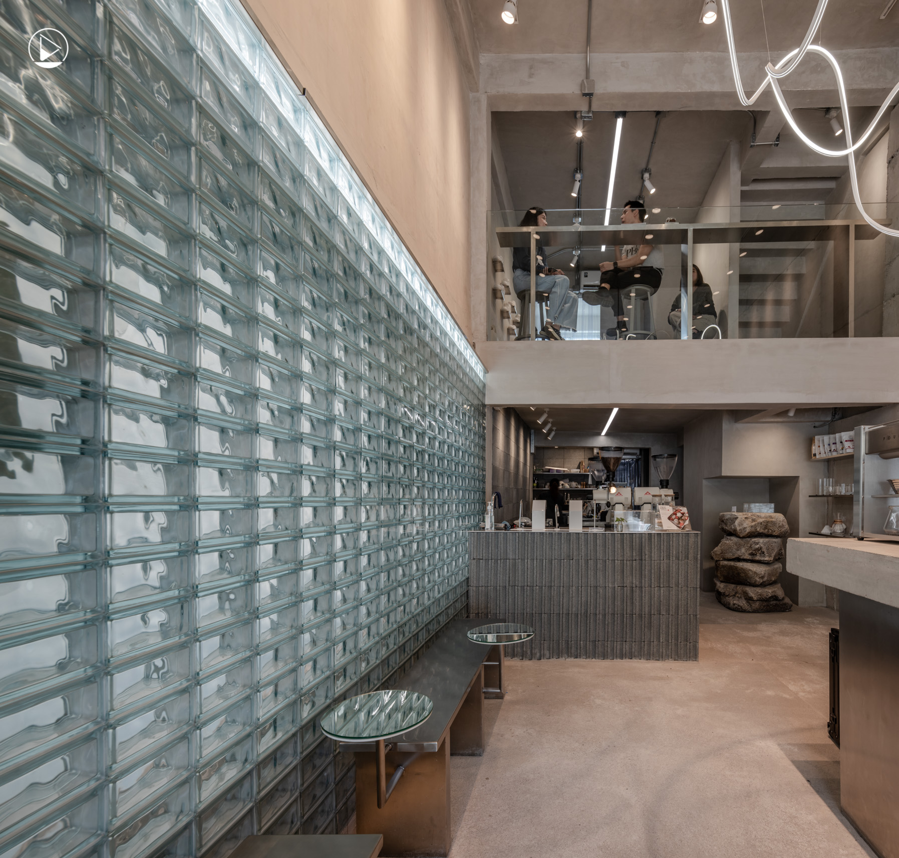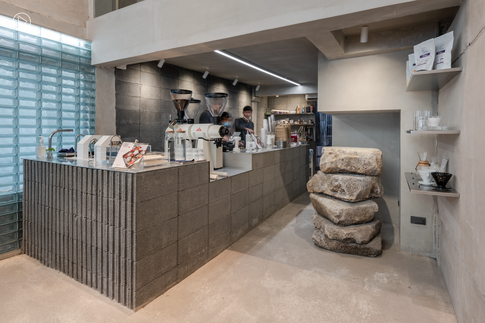 นอกจากความเป็นปูนที่ถ่ายทอดคาแรกเตอร์ดิบๆ แต่เรียบง่าย อีกด้านหนึ่งของผนังคุณหมึกตัดสินใจทำเป็นผนังบล็อกแก้ว เนื่องจากแต่ก่อนผนังด้านนี้เคยเป็นกระจกฝ้า ซึ่งทำให้ร้านข้างๆ สามารถมองทะลุผ่านเข้ามาด้านในได้ การใช้ผนังบล็อกแก้ว จึงเป็นสิ่งที่ช่วยพรางสายตา และสร้างลูกเล่นบนผนังได้เป็นอย่างดี