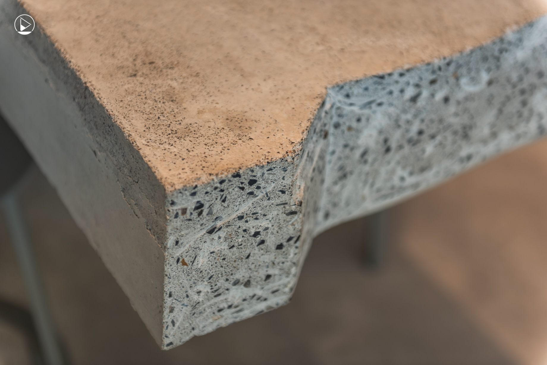 อีกสิ่งที่โดดเด่นไม่แพ้กับสายไฟนีออนคือ โต๊ะเคาน์เตอร์บาร์ยาว ที่ตั้งอยู่บริเวณกลางร้านที่เป็นพื้นที่ Slow Bar ด้วยโครงสร้างของขาโต๊ะที่ยึดกับพื้นไว้ด้วยเหล็กขนาดใหญ่ไว้เพียงฝั่งเดียว ทำให้เคาน์เตอร์ปูนขนาดใหญ่ที่หนักแน่นกลับมีลักษณะดูเบาเหมือนลอยได้ ส่วนอีกด้านตรงปลายของเคาน์เตอร์มีรายละเอียดที่ให้ความรู้สึกเหมือนยังไม่จบ โดยมีการกระแทกปูนตรงโต๊ะออกจนเกิดเป็นร่องรอยที่น่าสนใจ