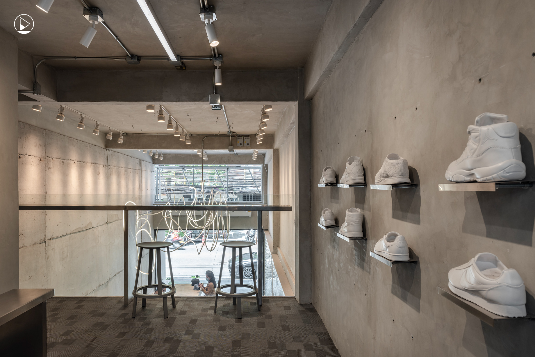 ตัวร้านแบ่งออกเป็น 2 ชั้น ได้แก่ บริเวณชั้นล่างที่ประกอบไปด้วยโซนพื้นที่นั่ง และเคาน์เตอร์บาร์สำหรับชงกาแฟ ส่วนพื้นที่ชั้นลอยจะเป็นโซนพื้นที่นั่งเล็กๆ ที่มีผนังตกแต่งด้วยชั้นวางรองเท้าที่มีรูปปั้นรองเท้าสนีกเกอร์สีขาวหล่อจากปูนปลาสเตอร์วางเรียงอยู่บนชั้น ซึ่งหากนั่งอยู่ในบริเวณนี้ก็จะเห็นบรรยากาศมวลรวมของร้านทั้งหมด