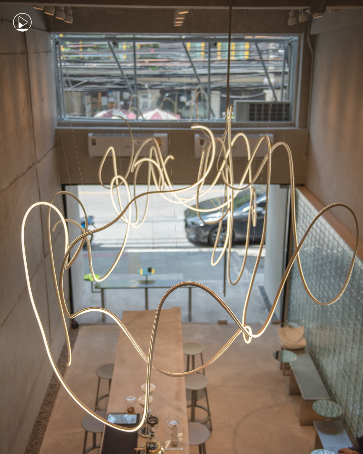 แต่สิ่งที่โดดเด่นและดึงดูดสายตาผู้คนที่ก้าวเท้าเข้ามาด้านในร้านมากที่สุด เห็นจะเป็นเส้นสายไฟสีขาวที่ขดกันไปมาจนเหมือนเป็น Installation Art ซึ่งเกิดจากสายไฟ LED ที่มีความยาวประมาณ 5 เมตร จำนวน 5 เส้นมาห้อยเรียงขดกันอยู่บนเพดานอย่างไม่ตั้งใจ ซึ่งเดิมทีก็ไม่ได้ถูกวางไว้ให้มีลักษณะ Free form อย่างที่เห็น แต่ต้องการให้สายไฟ LED มีรูปทรงเป็นเลขแปด
