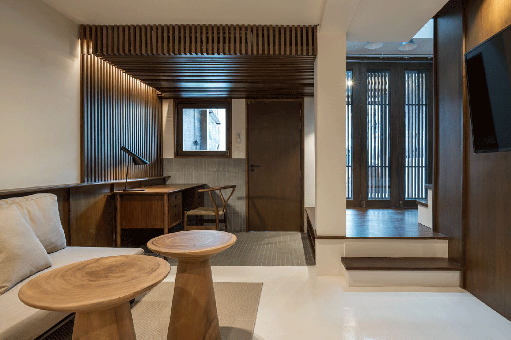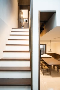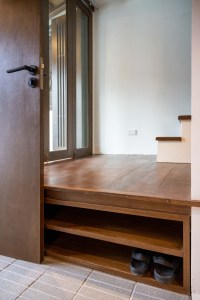 และตัวชาน ที่ยกจากพื้นมา 40 cm. ในบ้านด้านใต้เป็นชั้นวางรองเท้า และพอมันยกจากพื้นมา 40 cm. เลยทำให้เป็น built-in bench ไปด้วย สามารถนั่งใส่รองเท้าได้