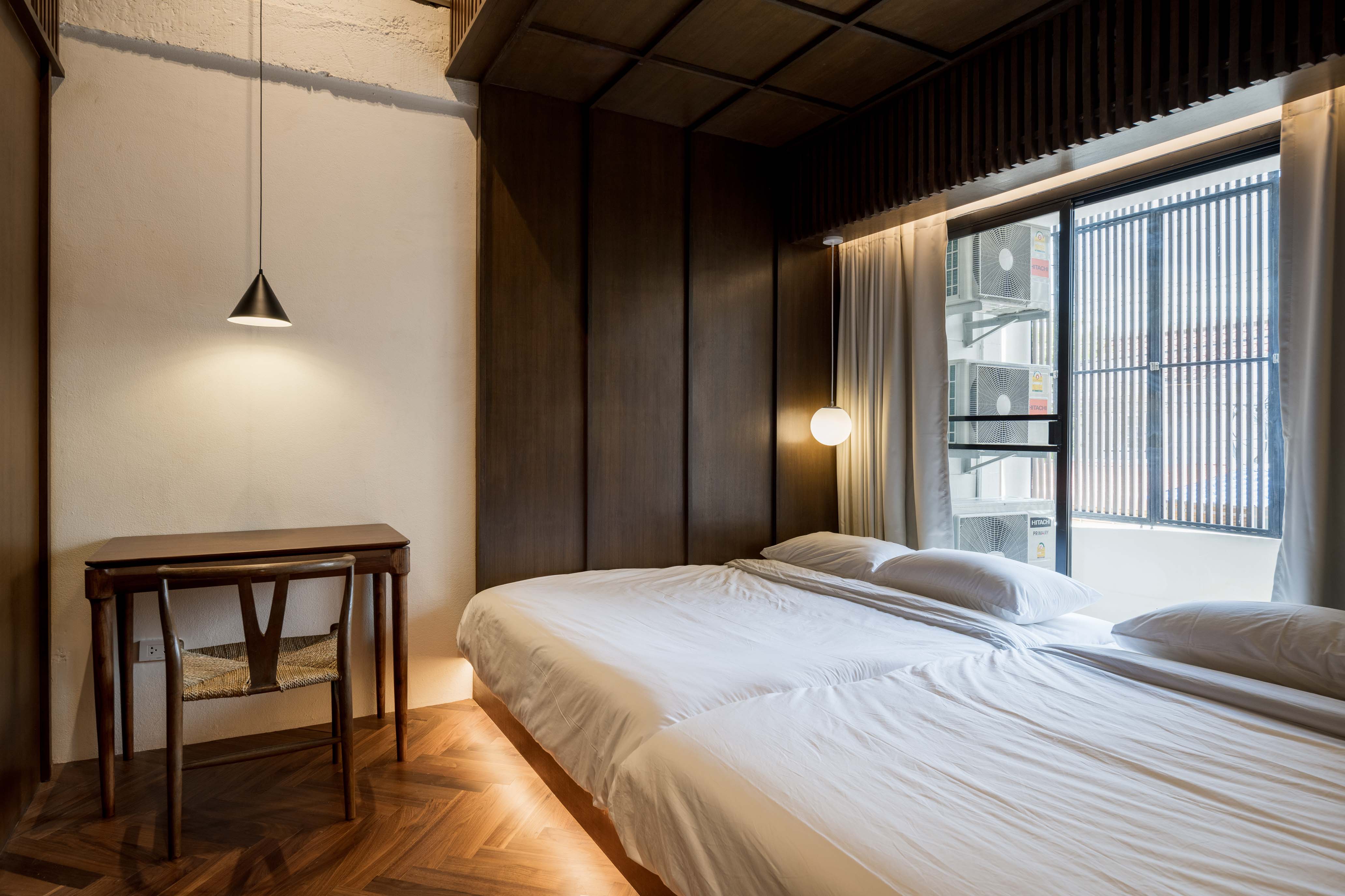 ส่วนโต๊ะทำงานเอามาไว้หน้าบ้านเพราะเป็นพื้นที่ที่ได้แสงธรรมชาติตอนกลางวันสาดถึง จะได้ไม่ต้องพึ่งหลอดไฟค่ะ ชั้น 2 เลือกที่จะวางห้องน้ำไว้หลังบ้านเพราะงาน service เก่าด้วย และแสงตอนกลางวันที่เข้าทางหลังบ้านค่ะ พอวางห้องน้ำไว้ตรงนั้นจะได้ช่วยฆ่าเชื้อโรคแล้วเป็น buffer แผงกั้นความร้อนระหว่างภายนอกบ้านกับห้องนอนค่ะ ส่วนการเชื่อมกันระหว่างทั้ง2ห้องนอน ถ้าพักทั้งครอบครัวเปิดประตูไว้ก็จะช่วยทำให้ทั้ง 2 ห้องนอนรู้สึกกว้างขึ้น แต่ถ้าอยากได้ความเป็นส่วนตัวก็ปิดประตูค่ะ