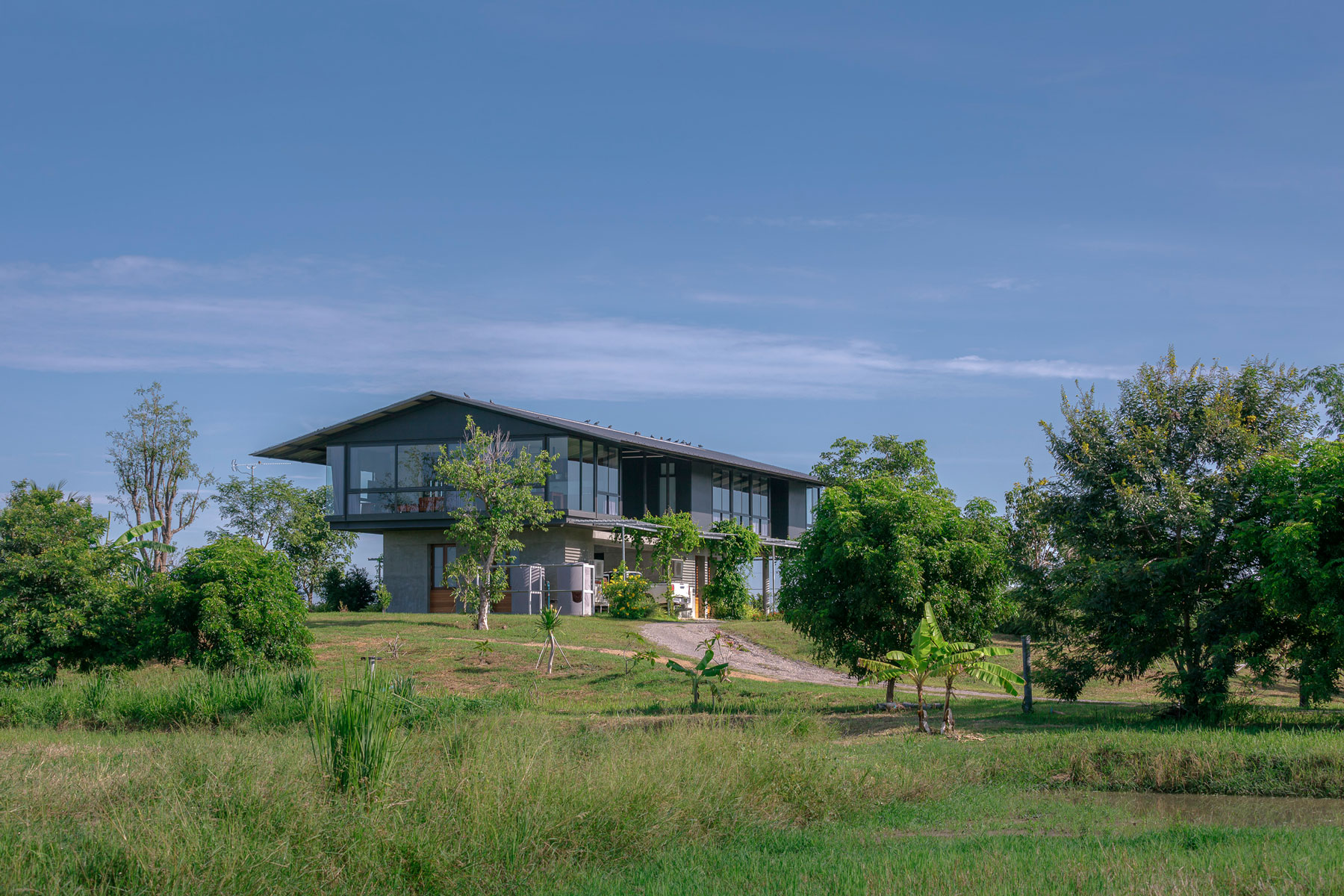จากโจทย์บนพื้นที่ดินไร่พลิสาขนาดกว้างที่เคยไร้ซึ่งข้อจำกัด ถูกเปลี่ยนรูปเปลี่ยนร่างเป็นบ้านกลางไร่ที่สถาปนิกเริ่มต้นวางผังอาคารให้สัมพันธ์กับแนวทิศ เพื่อให้ผู้อยู่อาศัยเริ่มต้นเช้าวันใหม่ไปพร้อมกับการมองเห็นวิวพระอาทิตย์ขึ้นและตก แต่เพื่อป้องกันไม่ให้อาคารได้รับแสงแดดที่สาดส่องพื้นที่ภายในมากเกินไป หลังคาจึงถูกออกแบบด้วยทรงจั่วเอียง 10 องศา และมีขอบเขตยื่นออกจากบ้านประมาณ 2.5 เมตรตามแนวทิศตะวันออกและตะวันตกซึ่งเป็นวิวหลักที่ผู้อยู่อาศัยมองเห็น
