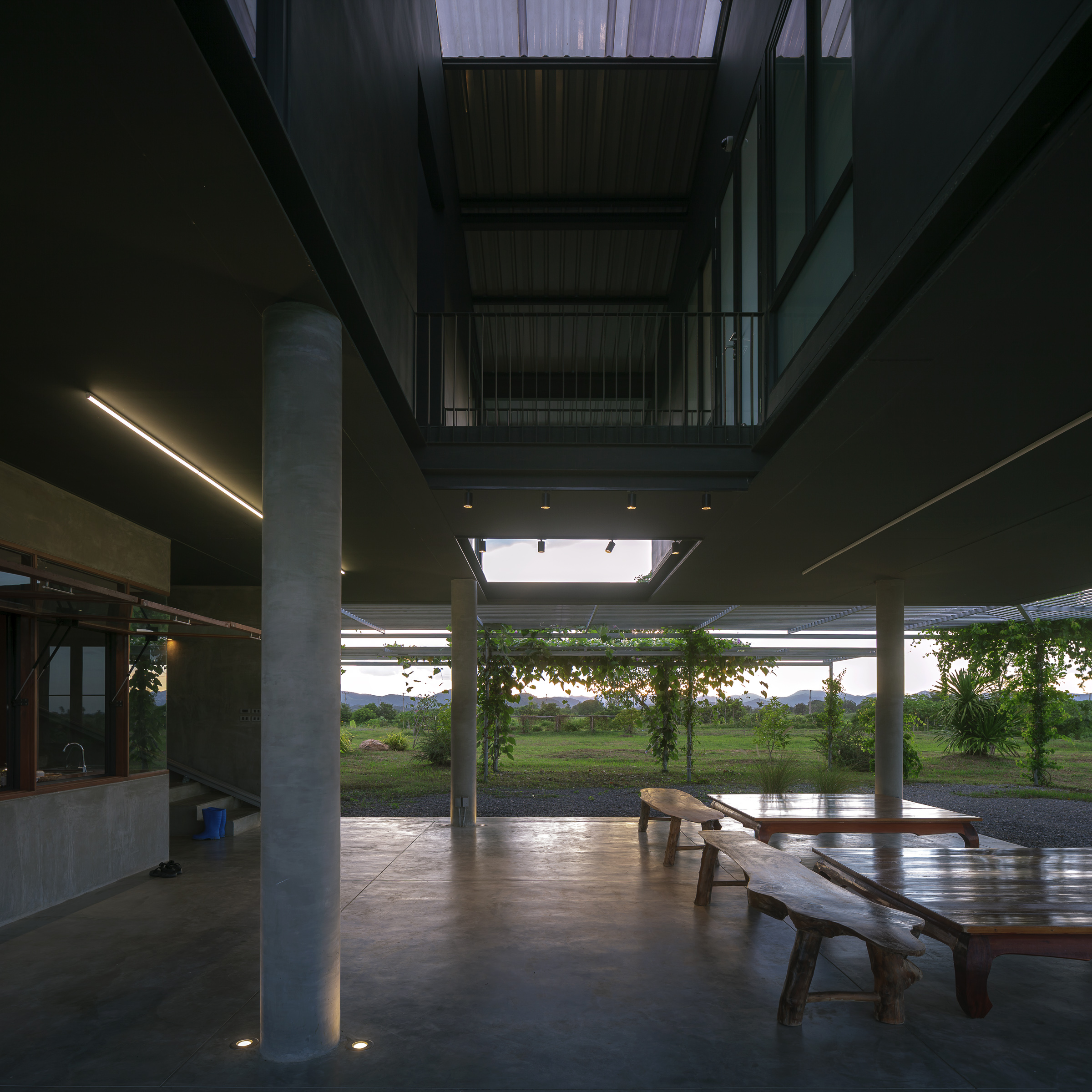 ผังอาคารถูกวางฟังก์ชันเรียบง่ายตรงไปตรงมาเช่นเดียวกับรูปลักษณ์ภายนอก โดยชั้นล่างออกแบบในลักษณะใต้ถุนที่เราคุ้นเคยแบบบ้านไทยโบราณ เปิดให้ลมธรรมชาติพัดผ่านเข้ามาเป็นส่วนหนึ่งของการอยู่อาศัย ถัดเข้าไปสถาปนิกไล่ลำดับการเข้าถึงด้วยการเป็นครัวขนาดใหญ่ และส่วนเซอร์วิสต่างๆ โดยพื้นที่บริเวณชั้นหนึ่งถูกออกแบบให้มีขนาดที่กระชับกว่าเพื่อให้โครงสร้างชั้นสองช่วยบังแดดให้ไปในตัว