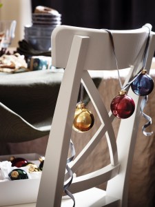 - เพิ่มกิมมิกให้เก้าอี้ ใช้ริบบิ้นที่มีความยาวสักหน่อยมาพัน ตกแต่งด้วยของประดับต่างๆ พร้อมป้ายชื่อแขกแต่ละคน เพื่อสร้างบรรยากาศมื้ออาหารช่วงคริสต์มาสสุดประทับใจ