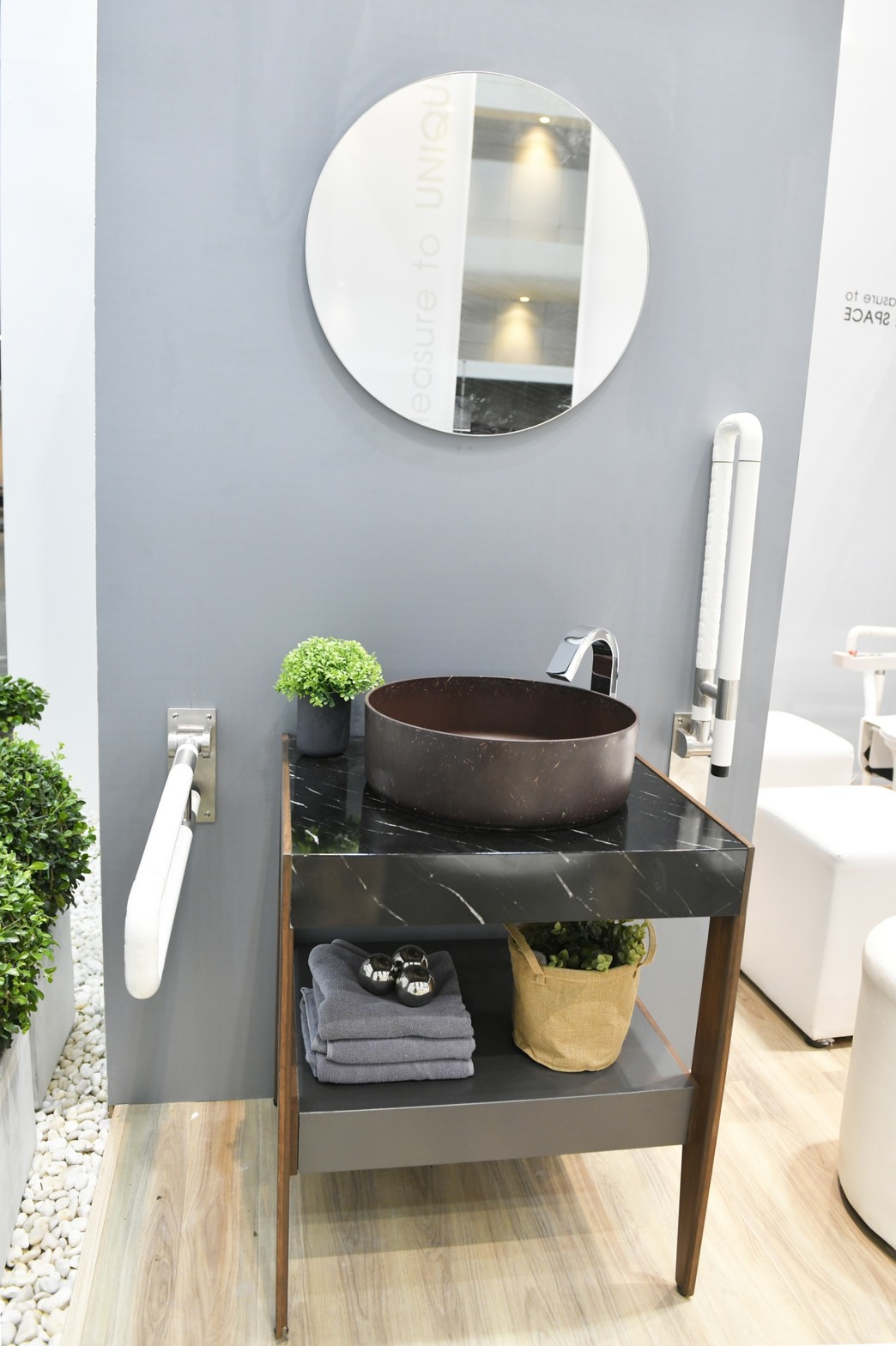 3. Elder Cushy เป็นซีรีย์ห้องน้ำผู้สูงอายุ ในกลุ่มนี้ “โมเก้น” ทำการผสมใยธรรมชาติเข้าไปในเนื้อเมลามีน ทำให้การผลิต Bathroom Furniture และตัวอ่างล้างหน้ามีน้ำหนักเบากว่าเซรามิกทั่วไปกว่าเท่าตัว หมดกังวลเรื่องอุบัติเหตุที่ไม่อาจคาดคิด หรือแม้แต่การแตกหักที่ดูเป็นอันตรายก็เกิดได้ยาก อีกทั้งการออกแบบจัดวางเครื่องสุขภัณฑ์ ใช้หลักการออกแบบ Universal design ได้อย่างลงตัว ซึ่งโมเก้นยังมีผลิตภัณฑ์ในห้องน้ำหลากหลาย ที่ช่วยให้ผู้สูงอายุใช้งานได้สะดวกสบายและปลอดภัยยิ่งขึ้น ส่วนการเลือกใช้โทนสี Earth Tone ก็เพื่อให้มีความสบายตา ดูอบอุ่น ไม่ฉูดฉาด ให้ความรู้สึกสุขสงบ เหมาะกับผู้สูงวัย