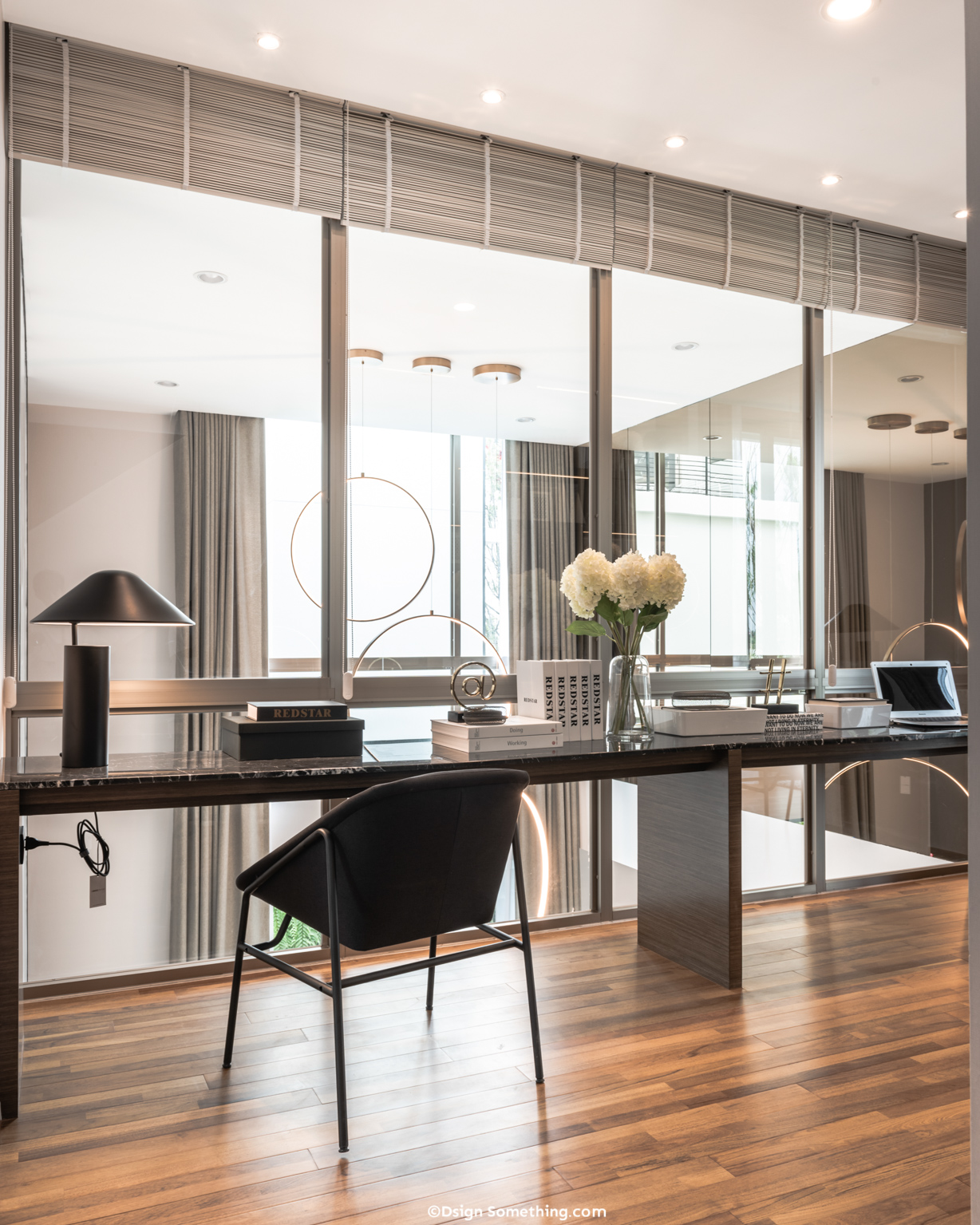 ความโมเดิร์นที่เกิดขึ้นในพื้นที่ที่เพิ่มมากขึ้นจึงสามารถเติมตัวตนในสไตล์ที่ตัวเองชอบเข้าไปในห้องส่วนตัวได้อย่างเต็มที่ ที่เหลือจึงเป็นหน้าที่ของงานดีไซน์ส่วนรายละเอียดที่ช่วยเติมให้กิจกรรมภายในบ้านเป็นไปอย่างสะดวกสบาย ทั้งกระจกตัดหัวมุมช่วยเปิดแสงธรรมชาติและสร้างบรรยากาศที่เหมาะสมกับการใช้ชีวิตอย่างมีชีวิตชีวา ฝ้าเพดานสูงช่วยสร้างความโปร่งโล่งสบาย และช่องเปิดจากระเบียงส่วนตัวยังช่วยดึงลมเข้าห้องนอน การระบายอากาศและหมุนเวียนอากาศจึงทำได้อย่างยั่งยืน