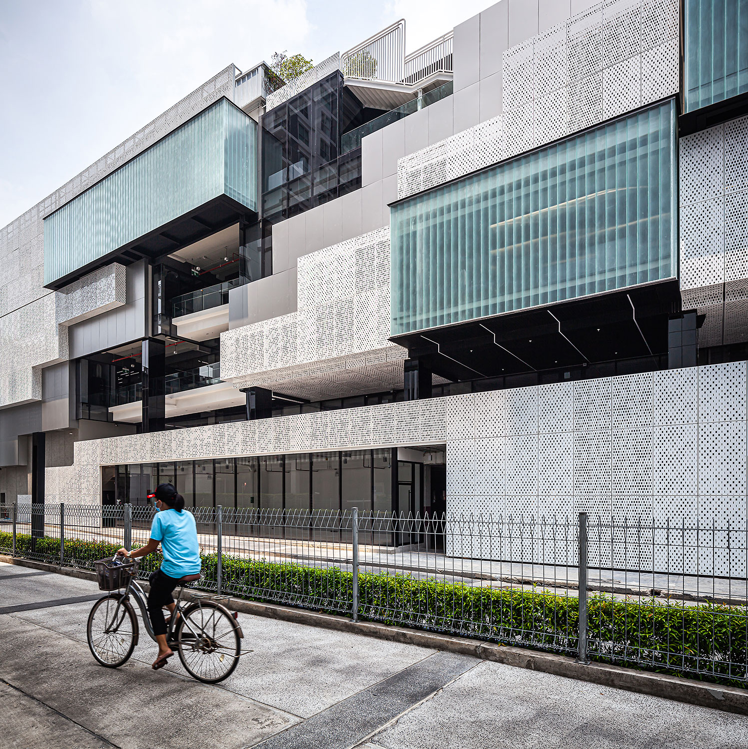ตัวอาคารภายนอกแสดงตัวตนให้ visible ในช่วงมิติเวลาที่แตกต่างไป ในเวลากลางวันอาคารจะโดดเด่นด้วยสีขาวที่มีลวดลายพื้นผิวแปลกตาเหมือนแผงวงจรอิเล็กทรอนิกส์ ส่วนในตอนกลางคืน อาคารจะเปล่งแสงแสดงตัวตนให้ visible ออกมา จากงานออกแบบไฟภายนอกอาคารที่ทั้งหมดจะถูกซ่อนเอาไว้ภายใน