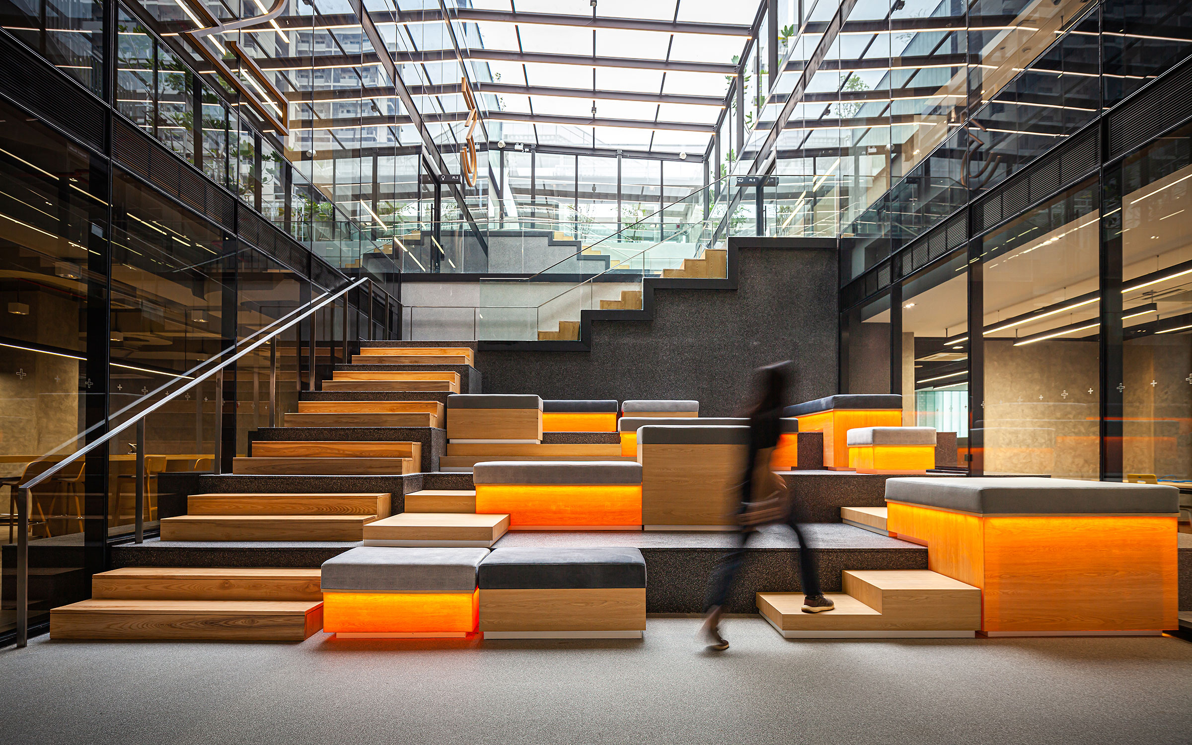 “จุดประสงค์ของชั้น 4 เนื่องจากเขาเป็น Tech company เขาจะมีการจัด Hackathon ที่คล้ายๆ อีเว้นท์หนึ่งที่จัดขึ้นมาเพื่อแก้ปัญหาหรือตั้งโจทย์ร่วมกัน เพราะฉะนั้นในแต่ละสเตจ จะมีลักษณะการใช้พื้นที่ไม่เหมือนกัน เริ่มจากสเตจแรกคนเยอะสุด ก็จะต้องใช้พื้นที่ที่เป็นลานอเนกประสงค์ มีการตั้งโต๊ะ มีการพรีเซ็นต์งาน หรือ pitch ไอเดียกัน มันก็จะต้องใช้ระบบของห้องประชุมขนาดใหญ่ที่รองรับคนได้เยอะ พอสองเรื่องนี้มาผนวกกันในขณะที่พื้นที่เรามีจำกัด เราก็เลยทำอัฒจรรย์ที่ยืดหดได้ เพื่อให้สเต็ปแรกของตรงนั่งอัฒจรรย์ก็ตั้งโต๊ะไปเลย ยี่สิบโต๊ะรับคนได้สองร้อยคน พอสเตจลึกๆ ก็ดึงอัฒจรรย์ออกมา” เพื่อรองรับคนจำนวนมากที่มาชมการนำเสนองาน