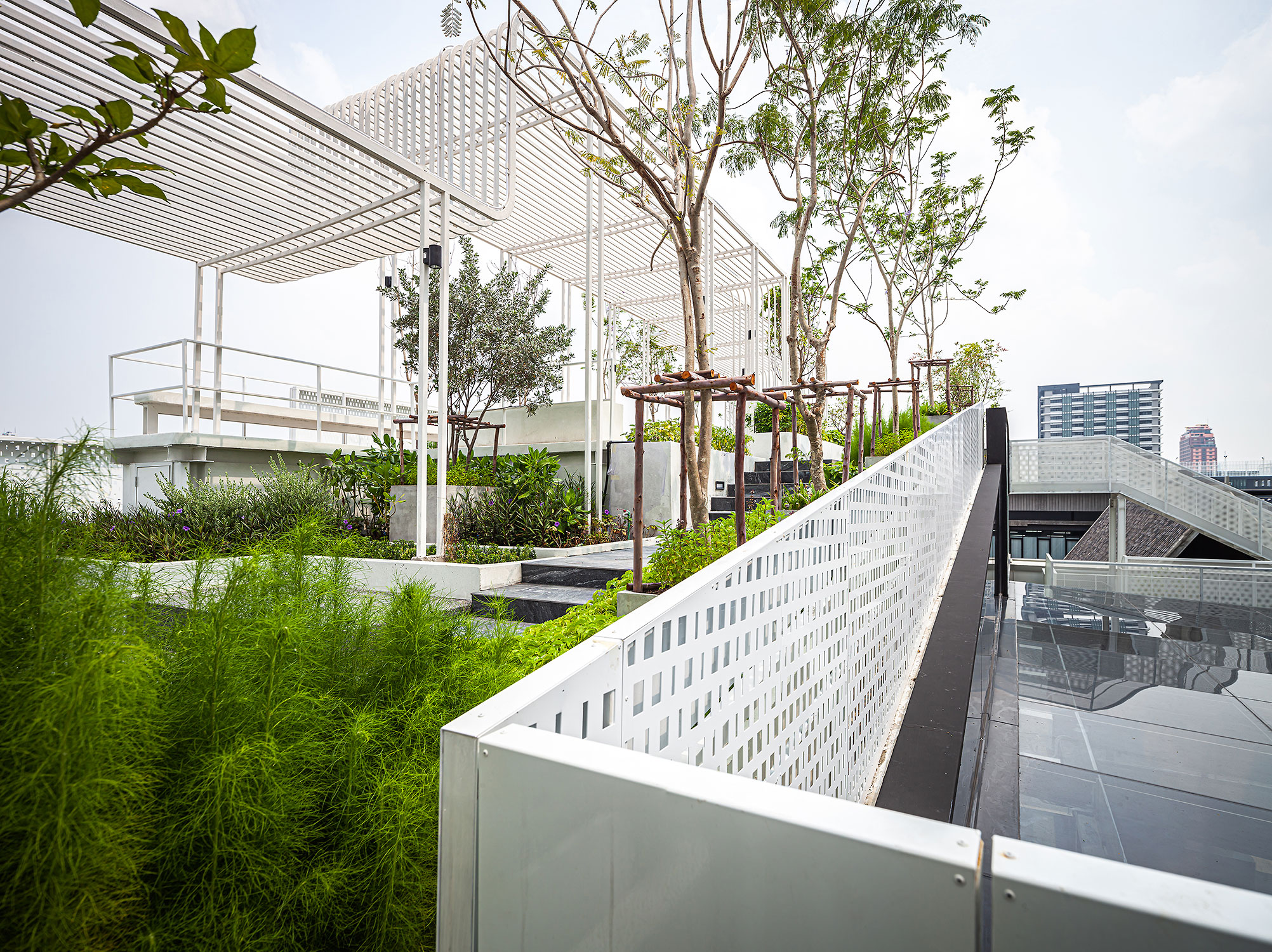 บนชั้นดาดฟ้าของอาคารสำนักงานยังมีสวนเล็กๆ ที่มีการไล่ระดับของสวนด้านล่างขึ้นไปสู่สวนด้านบน ซึ่งนอกจากจะสร้างบรรยากาศร่มรื่น สถาปนิกยังให้ความสำคัญในการสร้างพื้นที่เพื่อเอื้อให้เกิดการพบเจอและรู้จักกับคนใหม่ๆ มีการเข้าถึงกันและกันได้ง่ายมากยิ่งขึ้น รวมถึงมีการออกแบบที่เป็นมิตรต่อสิ่งแวดล้อม ซึ่งไม่ใช่มีแค่ต้นไม้ที่สวยงาม แต่ปลูกพืชพรรณออร์แกนิคด้วยสมุนไพรต่างๆ ที่พนักงานสามารถมีส่วนร่วมในปลูกหรือนำกลับบ้านได้ และด้วยพื้นที่จำกัด จึงเลือกออกแบบให้ทางเดินในสวนสามารถเดินวนลูปได้ เพื่อให้การเดินในสวนได้รู้สึกว่ามีความยาวมากกว่าพื้นที่ที่มีจริงๆ