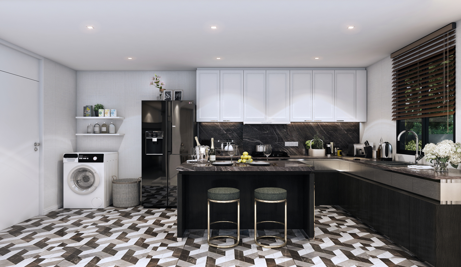 ส่วนห้องครัวจะตั้งอยู่ตรงข้ามกับโซนรับประทานอาหารโดยทำเป็นห้องแยกต่างหากเพื่อป้องกันกลิ่นรบกวนขณะประกอบอาหาร ภายในครัวยังมีพื้นที่กว้างให้ทำอาหารได้อย่างสะดวกสบาย เพียงพอสำหรับการวางตู้เย็น ซิงค์ล้างจาน และเคาน์เตอร์ทั้งรูปทรง I หรือ L ก็ได้ พร้อมกับการออกแบบที่รองรับการถ่ายเทอากาศจากครัวสู่ภายนอกเป็นอย่างดี
