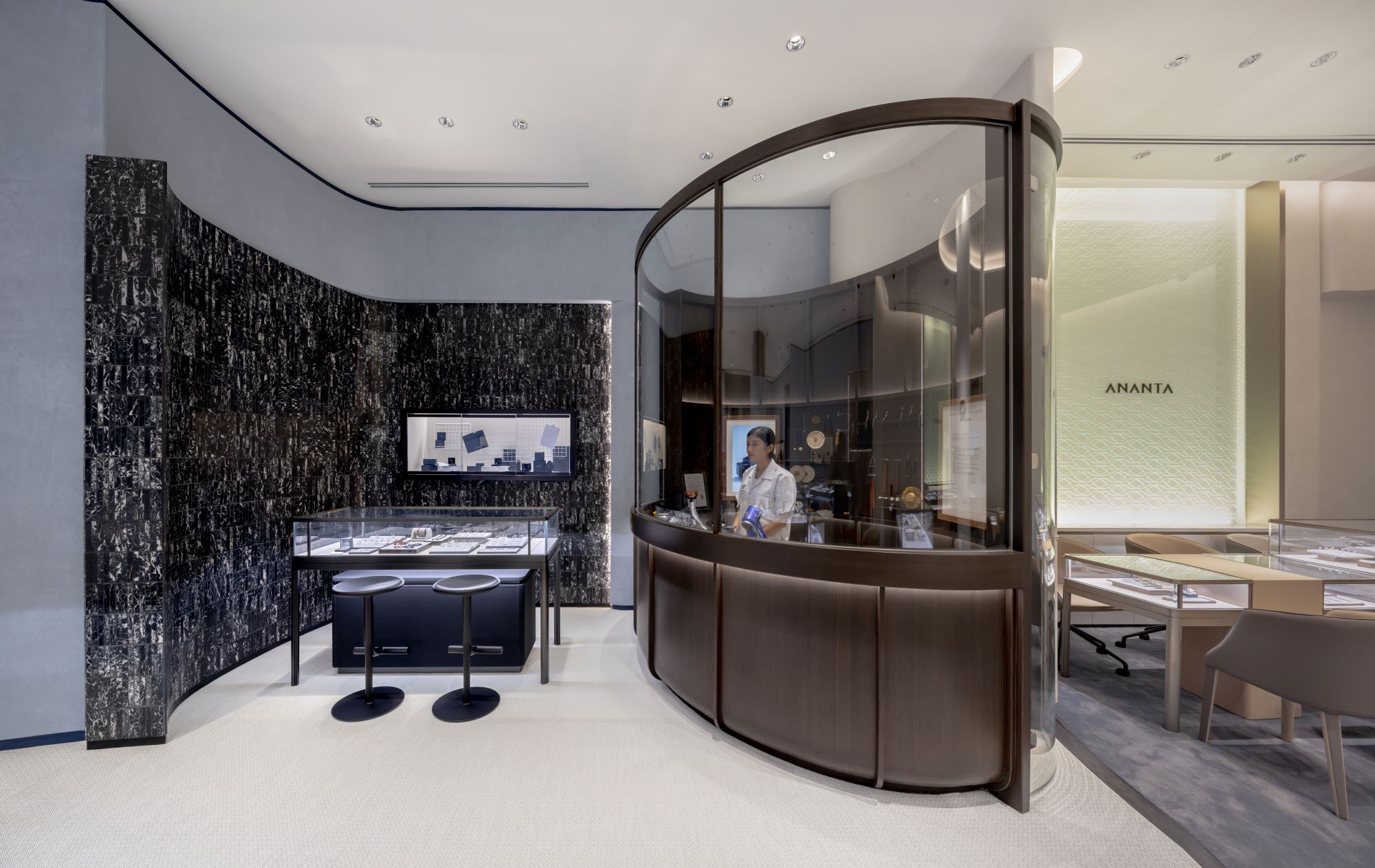 “เราเห็นเอกลักษณ์ของโลโก้ของแบรนด์ ANANTA ที่เป็นสัญลักษณ์อินฟินิตี้ไขว้กัน แสดงถึงความไม่มีที่สิ้นสุด ซึ่งสอดคล้องกับความหมายของคำว่า นิรันดร์ รูปลักษณ์เส้นโค้งของ ANANTA นี้ เลยน่าถูกนำมาใช้ในการวางแปลน สร้างคาแร็กเตอร์ของร้าน และสร้างภาษาที่ไหลต่อเนื่องไปทั่วทั้งร้าน โดยกรีดผนังบางส่วนแล้วดึงออกมาเป็นคอร์เนอร์ตามฟังก์ชันที่ลูกค้าอยากได้” นานา ตรรกวาทการ สถาปนิกผู้ดูแลโครงการ ANANTA เล่า