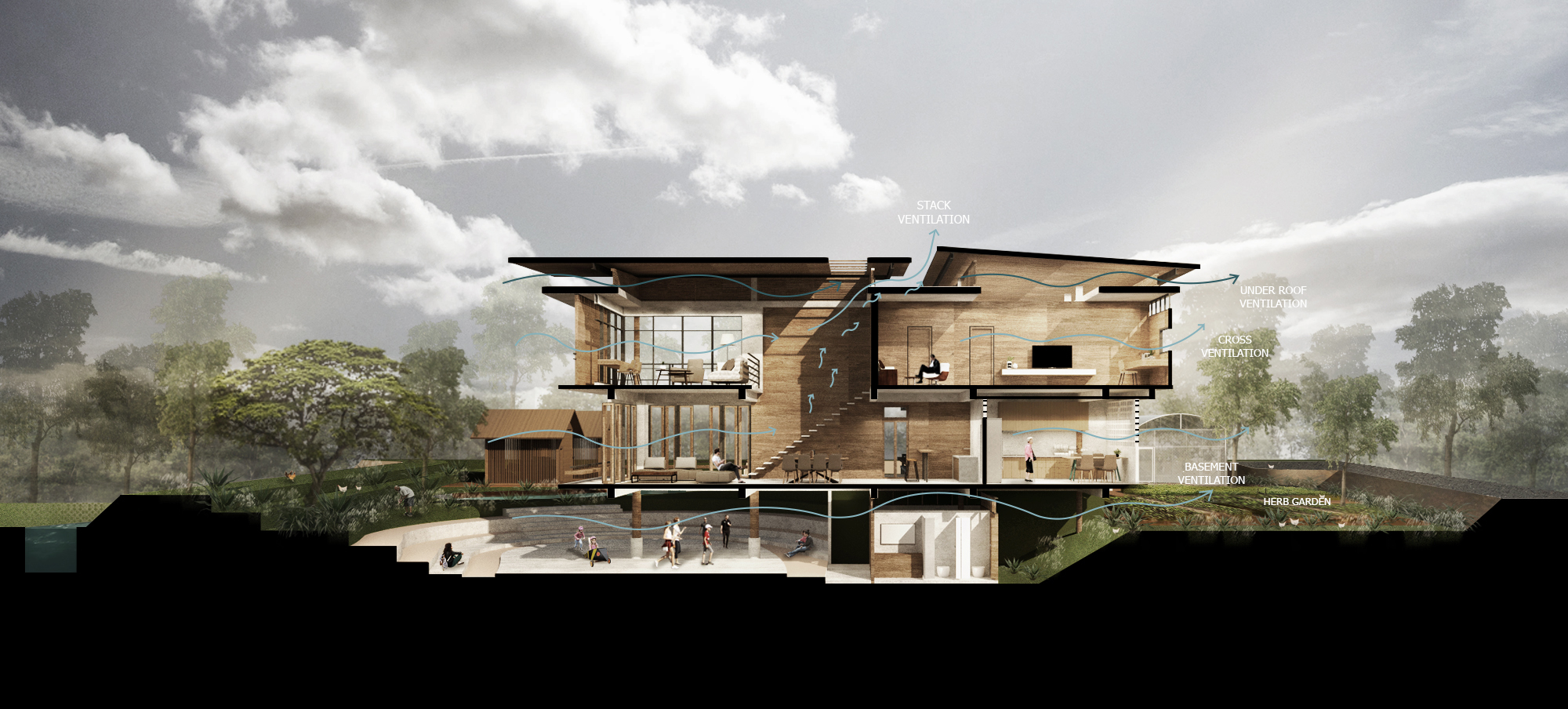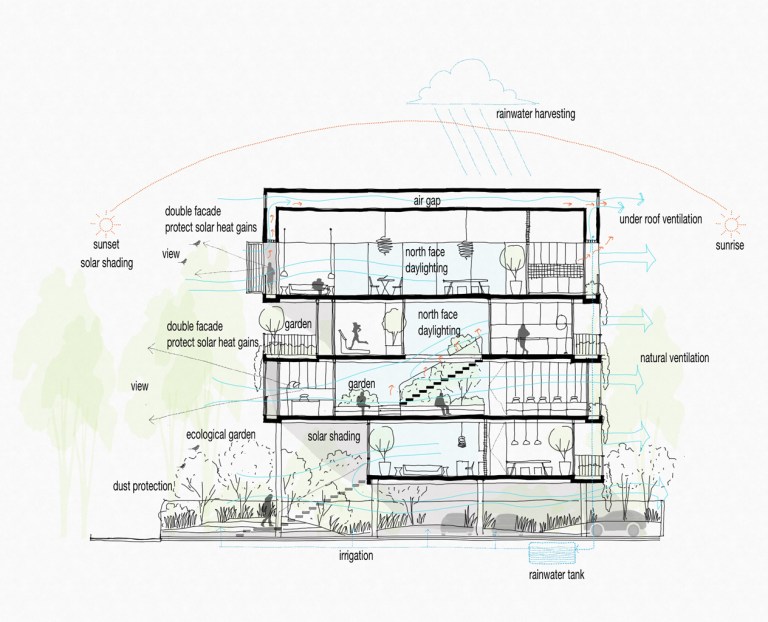 เมื่อความตั้งใจ คือการออกแบบสถาปัตยกรรมที่อยู่สบาย การออกแบบอาคารของ Eco Architect จึงต้องเข้าใจสภาพอากาศ หรือการ ‘Design by Climate’ เป็นสำคัญ ขั้นตอนแรกจึงเป็นการสำรวจ เก็บข้อมูลรอบๆ พื้นที่โครงการ เพื่อให้เข้าใจสภาพแวดล้อมในบริเวณนั้น การจัดการกับกระแสลม แสงแดดจากธรรมชาติ ต้นไม้เดิมในพื้นที่ บ่อน้ำ หรือแม้กระทั่งสภาพดิน “เราต้องเรียนรู้ทุกอย่างที่อยู่โดยรอบว่าเขาให้ประโยชน์อะไรกับเราบ้าง ให้โทษอะไรบ้าง เราจะเลือกอยู่กับเขาอย่างไร จะประนีประนอมกันอย่างไรให้ธรรมชาติก็อยู่ได้ และเราก็อยู่ได้ อันนี้เป็นจุดเริ่มต้นของกระบวนการออกแบบ” คุณแก้วเล่า