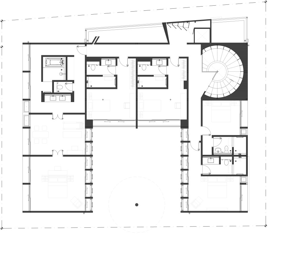 ขณะที่บริเวณมุมด้านในของบ้าน ถูกจัดวางให้เป็นพื้นที่โถงบันไดเวียนทรงกลม มีสัดส่วนชานพัก มีขั้นบันไดให้เดินสบายพอสมควร และใช้พื้นที่รอบรูปทรงกลมนี้ เป็นชั้นหนังสือสูงใหญ่ เป็นพื้นที่ที่ทุกคนต้องเดินผ่านทุกวัน ซึ่งเป็นโอกาสที่จะได้เห็นหนังสือที่ดีมีคุณค่า และให้ความสนใจหลังคาของโถงนี้ นอกจากนี้ ยังจัดให้มีช่องแสงเป็นวงแหวนล้อมรอบ นำแสงธรรมชาติ ไล้ผิวผนัง ต่อเนื่องลงมาที่ชั้นหนังสือ ทำให้สามารถใช้พื้นที่นี้ตอนกลางวันได้ด้วยแสงธรรมชาติ ซึ่งมีลักษณะเดียวกันกับการให้แสงของห้องทุกห้อง ที่ชั้นสองของบ้านหลังนี้
