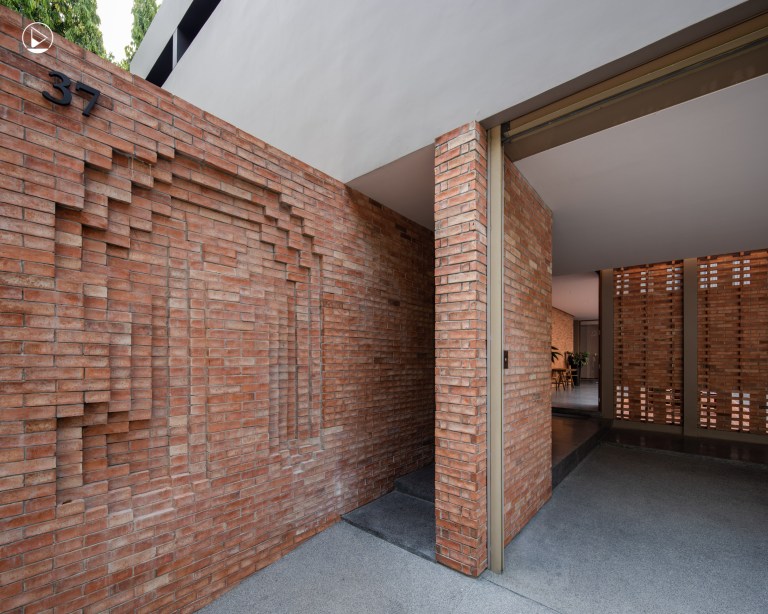 เพื่อเป็นบ้านที่มีความสงบมีสมาธิและให้พลังชีวิตกับทุกคน แต่ละห้องจัดวางพื้นที่และออกแบบให้เปิดรับลมและแสงธรรมชาติ กันฝนกันแดดได้ดี ในส่วนของโทนสีก็เลือกใช้สีเรียบง่าย ดูสบายตา ใช้วัสดุที่ทนกับดินฟ้าอากาศอย่างอิฐโบราณกับบริเวณที่ใกล้มือไกลตาของบ้าน เช่น รั้ว โรงรถ และลานกลางบ้าน ที่มีลักษณะการเรียงตัวแตกต่างกันไปตั้งแต่ผนังทึบ หรือการสร้างพื้นผิวและมิติที่สวยงามบนผนังอิฐด้วยการเรียงตัวให้มีช่องลมระบายอากาศได้จนถึงเรียงตัวกันเป็นสัญลักษณ์ตัวอักษร ภ ที่หน้าบ้านให้เป็นสัญลักษณ์เป็นคุณค่าความหมายกับบ้านไปตลอด