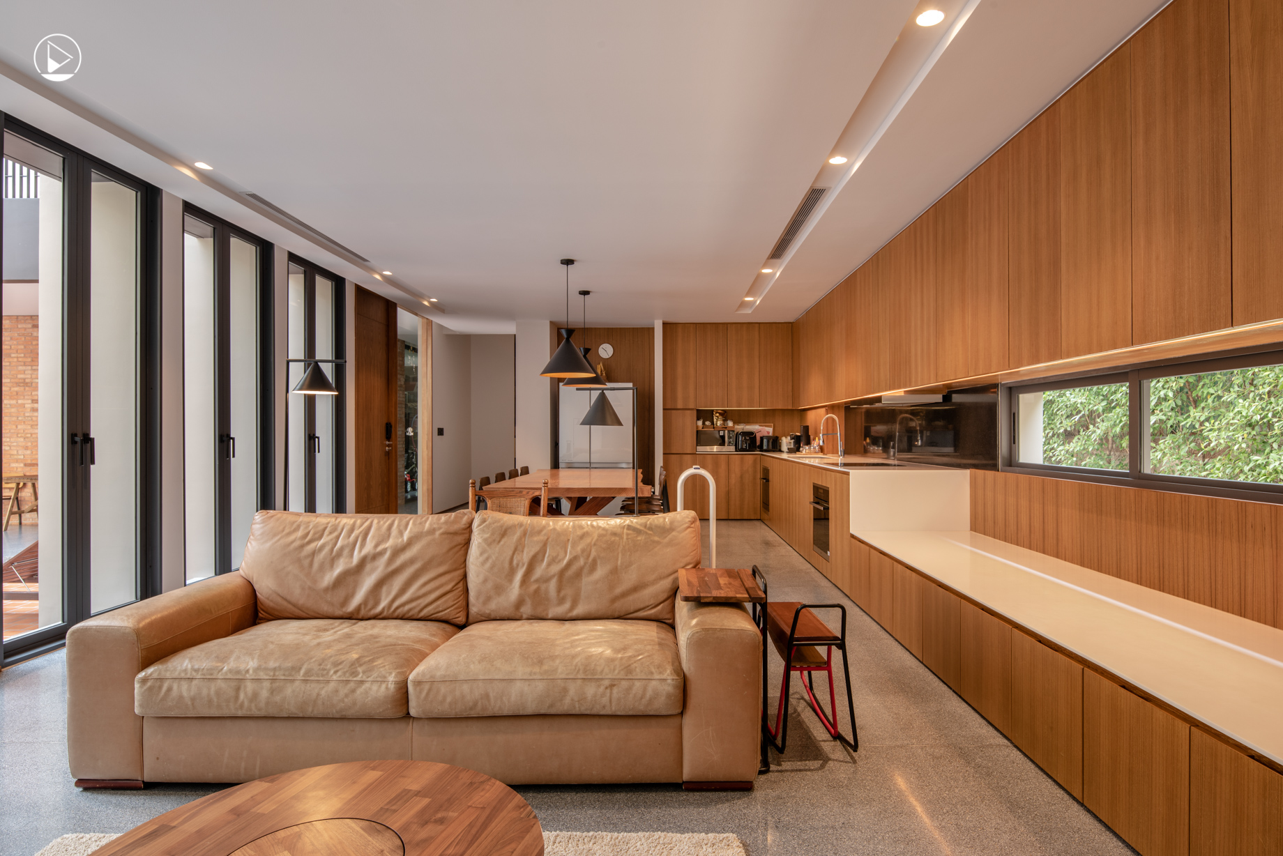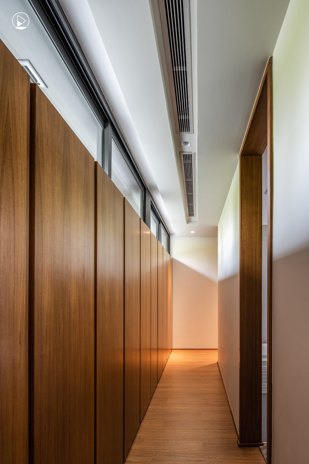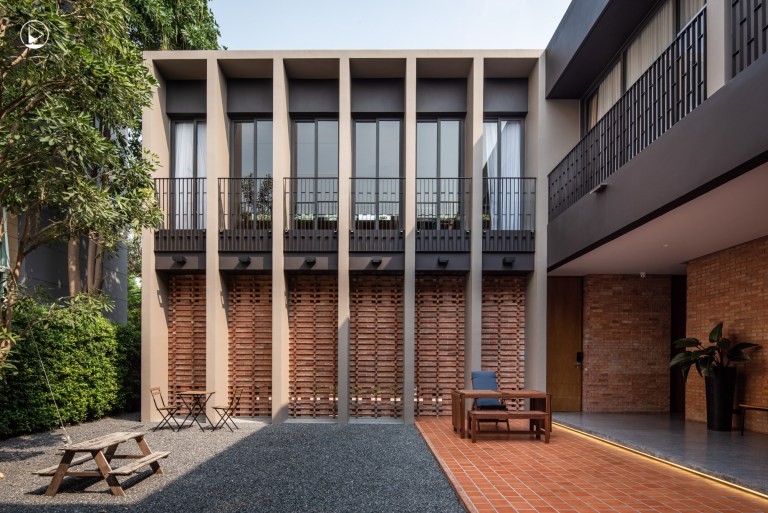 คุณเหลียงยังเล่าเสริมอีกว่า “เราเป็นบ้านที่ดูปิดทึบจากภายนอก แต่เปิดโล่งเข้าหาลานกลางบ้านภายใน ที่มีรายละเอียดของผนังครีบแนวตั้งเพื่อบังแดด และบังไม่ให้อาคารพักอาศัยสูงห้าชั้นมองเข้ามาเห็นในตัวบ้าน แต่เราสามารถเห็นกันเองได้”