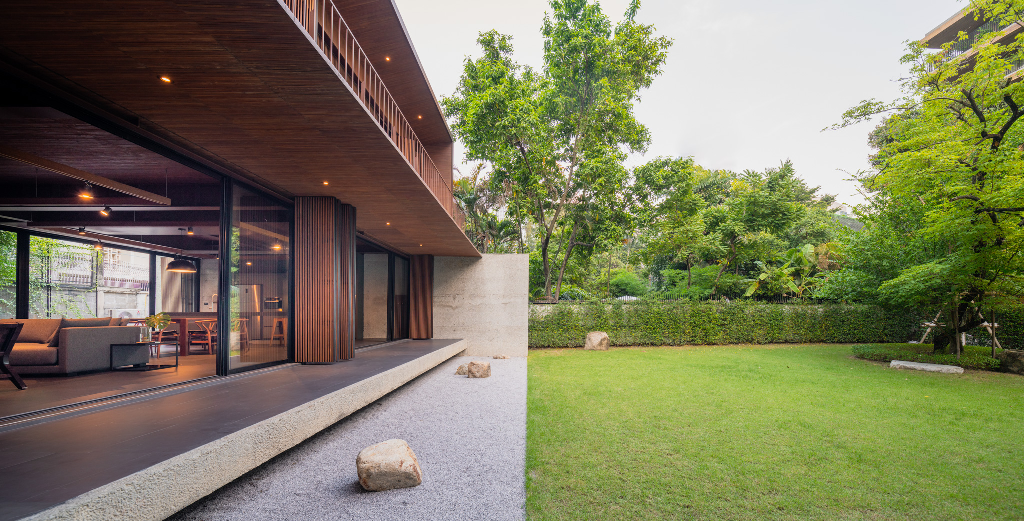 ยกตัวอย่าง บริเวณห้องนั่งเล่นที่เกิดขึ้นตั้งแต่ขั้นตอนวางผัง คุณวินมีภาพที่ตั้งใจให้ห้องนั่งเล่นมองเห็นผืนสีเขียวของสนามหญ้าทั้งหมด ผสานไปกับความสดใสของต้นเหลืองอินเดียซึ่งเป็นต้นไม้เก่าในพื้นที่ที่ตั้งใจเก็บไว้ มีระเบียงที่สามารถหย่อนขา นั่งพักสบายๆ ในวันว่าง หรือในบางครั้งหากนึกสนุก ลูกๆ ที่นั่งอยู่ในห้องนั่งเล่นก็สามารถวิ่งลงสนามไปเล่น เตะบอล หรือทำกิจกรรมกลางแจ้งได้ราวกับเป็นส่วนหนึ่งของธรรมชาติ