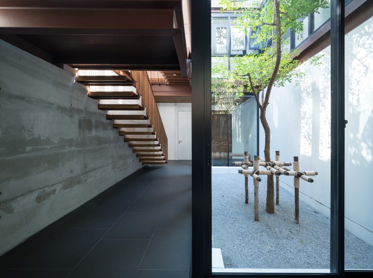 บริเวณใจกลางของบ้านจึงถูกออกแบบให้เป็นคอร์ดต้นปีป ที่เปิดรับแสงธรรมชาติ สามารถเปิดระบายอากาศ และเพิ่มบรรยากาศด้วยพันธุ์ไม้สีเขียว ซึ่งในขณะเดียวกันก็ทำหน้าที่เชื่อมสัมพันธ์ระหว่างพื้นที่ชั้นหนึ่งและชั้นสอง ทำให้พื้นที่ส่วนกลางของบ้านสามารถมองเห็นกันและกันได้ “เราคิดภาพนั้น สมมติเรากลับมาจากทำงานเหนื่อยๆ ถึงบ้าน เราก็อยากมองเห็นลูกนั่งเล่นอยู่ชั้นสองนะ” คุณวินเล่า