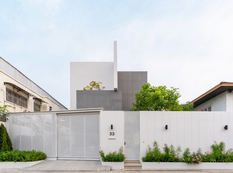 คุณต้นเริ่มอธิบายถึงกระบวนการออกแบบให้เราฟังว่า “ผมสังเกตบ้านรอบๆ หรือแม้แต่บ้านหลังเดิมของคุณพ่อคุณแม่ เขาจะมีการติดตั้งรั้วกรงเหล็กแสตนเลสอย่างหนาแน่น ไม่ว่าจะเป็นหน้าต่าง หรือประตูหลังทุกบาน ซึ่งผมมองว่าจริงๆ แล้วองค์ประกอบเหล่านั้น มันเป็นวิธีแก้ไขที่ปลายเหตุ แต่ถ้าผมดีไซน์บ้านให้ไม่มีใครมองเห็นภายในได้เลย ผมว่าคนในบ้านจะมีความปลอดภัยมากขึ้น ดังนั้น เราจะออกแบบให้ไม่มีช่องเปิดจากด้านหน้าบ้านเลยแม้แต่บานเดียว ทั้งหมดจะเป็น Solid”