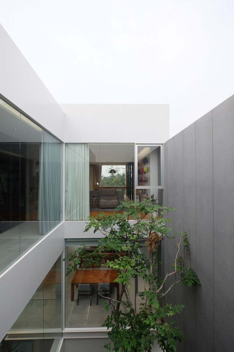หากจะมีเพียงกำแพงทึบที่ปิดล้อมบ้าน ก็อาจจะทำให้การอยู่อาศัยดูน่าอึดอัดไปเสียหน่อย ธรรมชาติจึงเป็นตัวแปรสำคัญที่จะเข้ามาเติมชีวิตชีวาให้กับการอยู่อาศัยภายใน พื้นที่ Void ที่เหลือถูกออกแบบให้เป็นคอร์ดยาร์ดที่เปิดให้ธรรมชาติเข้าแทรกตัว คอร์ดทั้ง 4 ทิศขนาบข้างไปกับฟังก์ชันหลักภายใน ซึ่งสถาปนิกทำลายความเป็นห้องด้วยการออกแบบพื้นที่ในลักษณะ Open Space การอยู่อาศัยภายในจึงเปิดโล่ง ชื่นชมธรรมชาติได้อย่างเต็มที่ โดยมีผนังบังสายตาจากภายนอกอีกหนึ่งชั้น