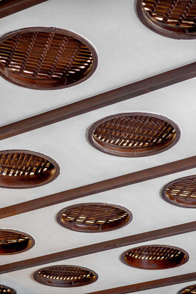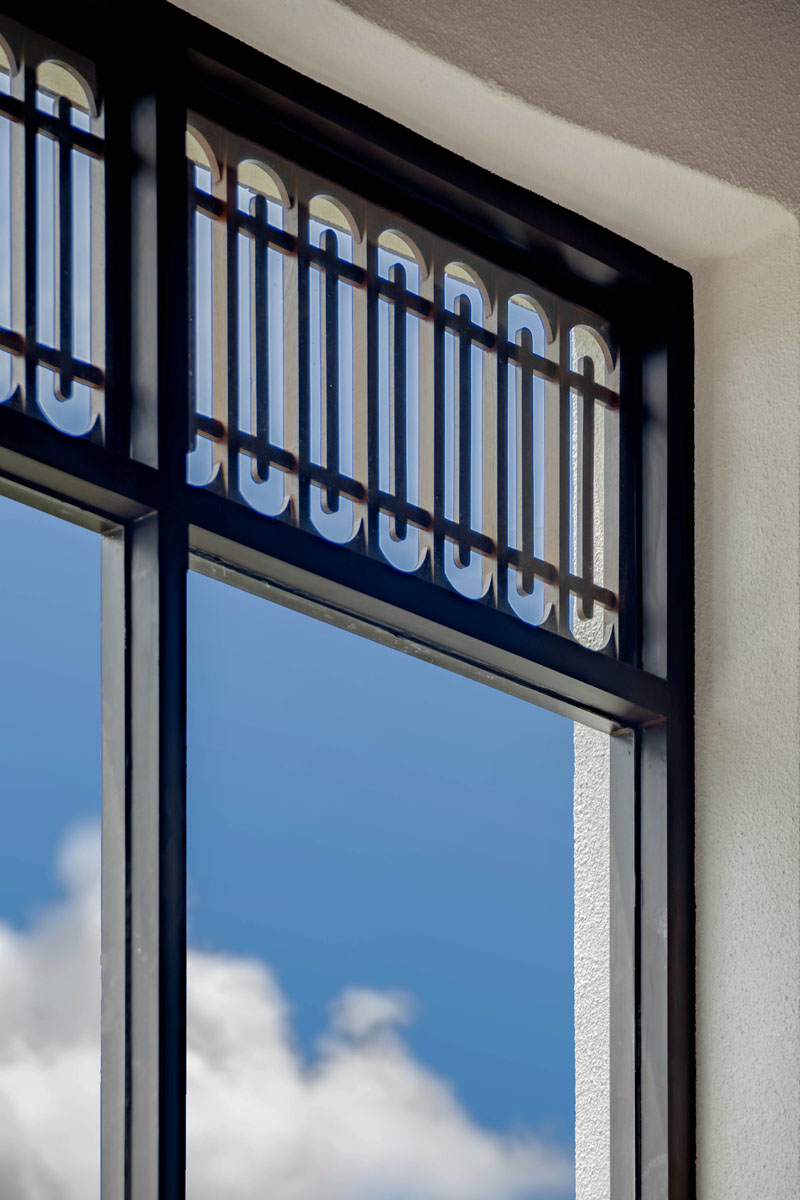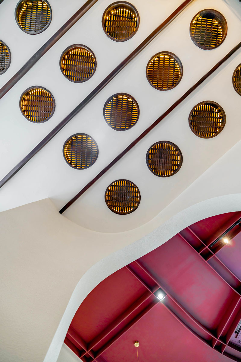 บริเวณหน้าต่าง ยังดีไซน์กรอบกระจกด้วยลูกฟัก ซึ่งเป็นองค์ประกอบแบบไทยๆ ที่ช่วยกรองแสงและสร้างมิติของเงา เช่นเดียวกับกระจก Arch โค้งที่มีการฉลุไม้และทำแพทเทิร์นใหม่ขึ้นมา เป็นดีเทลเล็กๆ ที่ซุกซ่อนอยู่อย่างน่าสนใจ