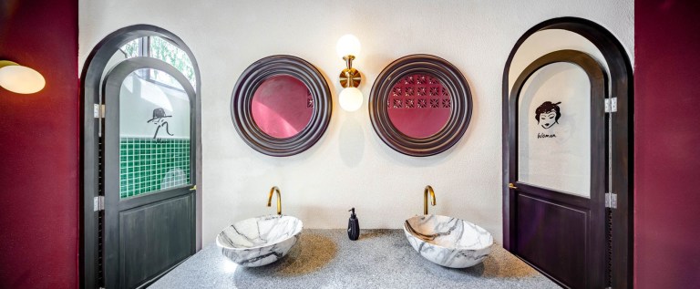 ถึงแม้จะมีขนาดไม่ใหญ่นัก แต่ขอบอกว่าห้องน้ำก็สอดแทรกแนวคิดและรายละเอียดของการออกแบบไม่แพ้ตัวร้าน โดยภายในถูกดีไซน์ด้วยวัสดุหลักจากกระเบื้องโมเสกหกเหลี่ยม ซึ่งนำสีขาวและสีแดงมาผสมผสาน สร้างเรื่องราวของการเฟดเพื่อให้สีขาวเบลนไปกับแสงธรรมชาติได้อย่างมีกิมมิค สำหรับห้องน้ำหญิง จะมีการเพนท์ภาพผู้หญิงเก๋ในชุดจีนซึ่งสะท้อนคาแร็กเตอร์ของตัวร้านที่ยังมีความนำวัฒนธรรมเก่าและใหม่มาผสมผสานกันอย่างลงตัว ส่วนห้องน้ำชายแตกต่างด้วยการใช้กระเบื้องสระว่ายน้ำสีเขียว ตัดกับโทนสีแดงซึ่งเป็นสีหลักของร้านได้อย่างพอเหมาะพอเจาะ