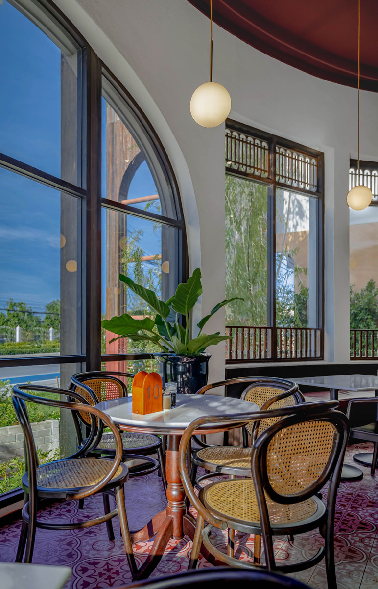ซุ้มโค้ง Arch ด้านซ้าย ชวนเราก้าวเข้าสู่โซนรับประทานอินดอร์ ซึ่งกดฝ้าให้ต่ำลงและออกแบบด้วยโทนสีแดงเพื่อสร้างความรู้สึกเป็นมิตรและเข้าถึงง่าย ให้ผู้คนสามารถนั่งกินสบายๆ ได้อย่างเป็นตัวเอง โต๊ะอาหารถูกจัดวางล้อมรอบไปตามรูปทรงครึ่งวงกลมของร้าน โดยมีการแบ่งขอบเขตให้ชัดเจนผ่านการใช้พื้นกระเบื้องลายดอกไม้โบราณ ในขณะที่บริเวณใจกลางโซนเป็นพื้นกระเบื้องเทอราซโซที่ง่ายต่อการดูแลทำความสะอาด และมีพาร์ทิชันเป็นจุดนำสายตา ซึ่งเกิดจากการนำเข่งติ่มซำเก่าจำนวน 240 ชิ้น มาจัดวางทำมุมที่แตกต่างกัน กลายเป็นแบ็กดร็อปที่สามารถถ่ายรูปได้ และยังสร้างเอฟเฟกต์ของแสงเงาที่น่าสนใจให้เกิดขึ้นภายใน