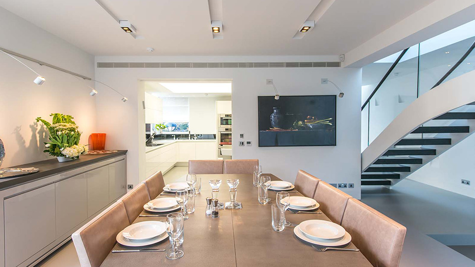 ส่วนบริเวณโต๊ะรับประทานอาหาร สามารถออกแบบเป็นโคมไฟฝังฝ้า แต่ต้องแน่ใจว่า โคมไฟทั้งหมดจะอยู่ในแนวกริดเดียวกัน เพื่อให้ภาพรวมของพื้นที่ดูทันสมัยและสบายตามากขึ้น และอย่าลืมว่การติดตั้งโคมไฟเพื่อเน้นการใช้งานต้องติดตั้งบริเวณดานหน้าของผู้ใช้งานเท่านั้น เพื่อลดแสงเงาตกกระทบที่จะรบกวนการใช้งานในพื้นที่ หากห้องครัวมีขนาดที่กว้างขวาง เราอาจจะเติมลูกเล่นด้วยแสงไฟเน้นไปที่ตัววัตถุ อย่างภาพวาด หรืองานศิลปะ ซึ่งสามารถใช้ได้ทั้งไฟฝังฝ้า และดวงโคมแบบ Picture Light ซึ่งสิ่งสำคัญที่ต้องคำนึงคือระยะการติดตั้งโคมไฟ เพื่อให้ได้ปริมาณแสงที่ดีที่สุด