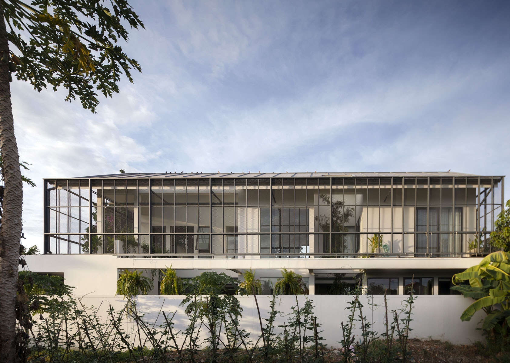 อย่างที่เราเห็นว่าพื้นที่ภายในให้ความรู้สึกอบอุ่นด้วยโทนสีขาว และไม้ ซึ่งทางเจ้าของชื่นชอบเป็นการส่วนตัว แต่สำหรับการออกแบบสถาปัตยกรรมภายนอกกลับให้อารมณ์ที่ต่างไป ด้วยความที่ผืนที่ดินอยู่ในลักษณะลึก อาคารจึงไม่ได้แสดงตัวตนผ่าน Elevation (รูปด้านอาคาร) เท่าไรนัก ตัวบ้านจึงถูกออกแบบมาในลักษณะของกล่อง ฟอร์มของอาคารทรงจั่วที่ชัดเจนในตัวเอง แต่ทิ้งระยะห่างของอาคารผ่านฟาซาดเหล็กบางๆ ทำให้เมื่อเรามองจากภายนอก อาคารจะจางหายไป ราวกับโดนห่อหุ้มไว้ด้วยธรรมชาติและเรื่องราวของการอยู่อาศัย