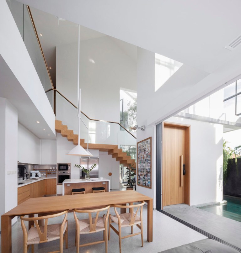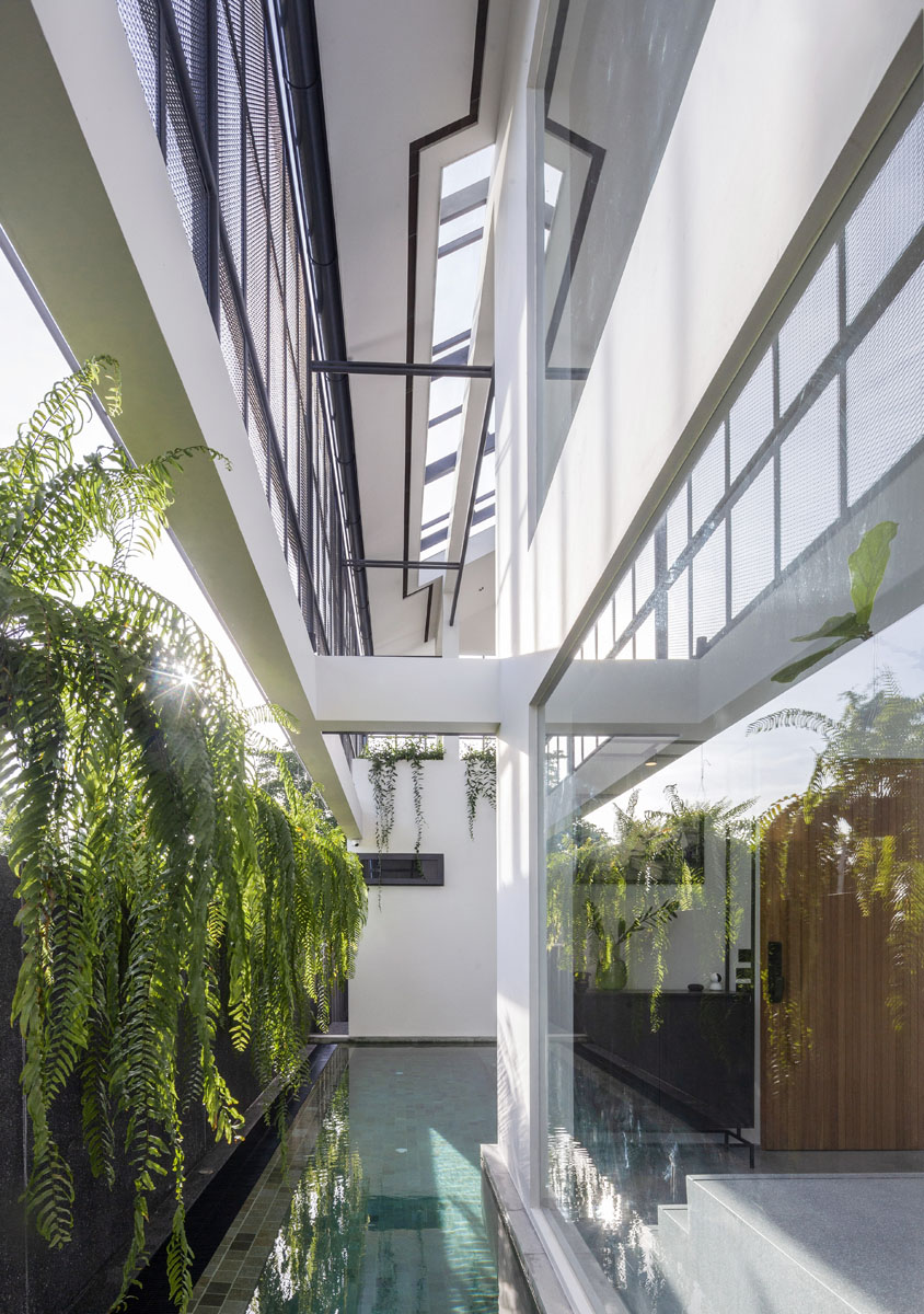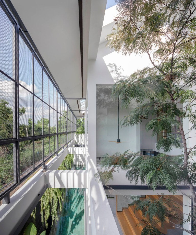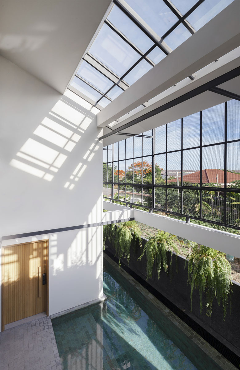 ช่องว่างระหว่างฟาซาด และหลังคาบริเวณพื้นที่สระว่ายน้ำ ยังถูกออกแบบให้เป็นพื้นที่ Semi-Outdoor โดยเจาะช่องเปิดหลังคาให้กลายเป็น Skylight ที่นำพาแสงแดดให้เข้าสู่ตัวบ้าน และเป็นตัวช่วยหล่อเลี้ยงให้สิ่งมีชีวิตอย่างต้นโอ๊คเติบโตภายในบ้านได้อย่างสมบูรณ์ โดยพื้นที่ Double Space ยังช่วยเพิ่มระยะ ทำให้แสงแดดที่ส่องผ่าน Skylight อยู่ในปริมาณที่พอดี ไม่สร้างความร้อนโดยตรงให้กับตัวบ้านจนเกินไป