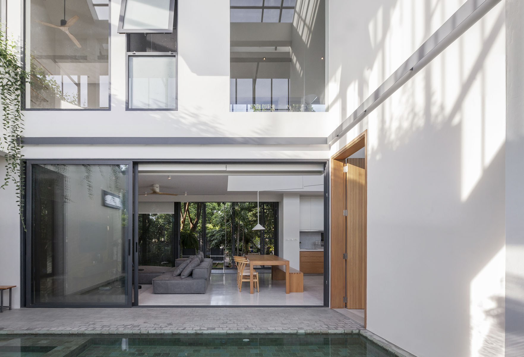 ทางฝั่งซ้ายของที่ดินซึ่งเป็นสวนของบ้านหลังเก่าทำหน้าที่เป็นมุมมองที่ดีของบ้าน พื้นที่สีเขียวช่วยกรองแสงและสร้างความร่มรื่นตลอดวัน ส่วนด้านขวาของบ้านซึ่งอยู่ทางทิศเหนือ สถาปนิกออกแบบให้เป็นสระว่ายน้ำ ซึ่งเปิดรับแสงธรรมชาติในปริมาณที่กำลังพอดี และลดความชื้นที่เกิดจากพื้นที่สระว่ายน้ำไปด้วยในตัว “เวลานั่งอยู่ในบ้าน ด้านขวาเป็นสระว่ายน้ำ ด้านซ้ายเป็นต้นไม้ มันเป็นข้อดีที่ว่า Perspective ที่เรามองไป มัน Inside-out มากๆ คือนั่งในบ้าน ทีวีแทบไม่ได้เปิดเลยนะ แทบไม่ได้โฟกัสเลยว่าตัวบ้านจะเป็นยังไง กลายเป็นว่าสเปซมันแกมบังคับให้เราต้องมองออกไปหาธรรมชาติที่อยู่รายล้อม อันนี้คือสิ่งที่เราตั้งใจ” สถาปนิกเล่า