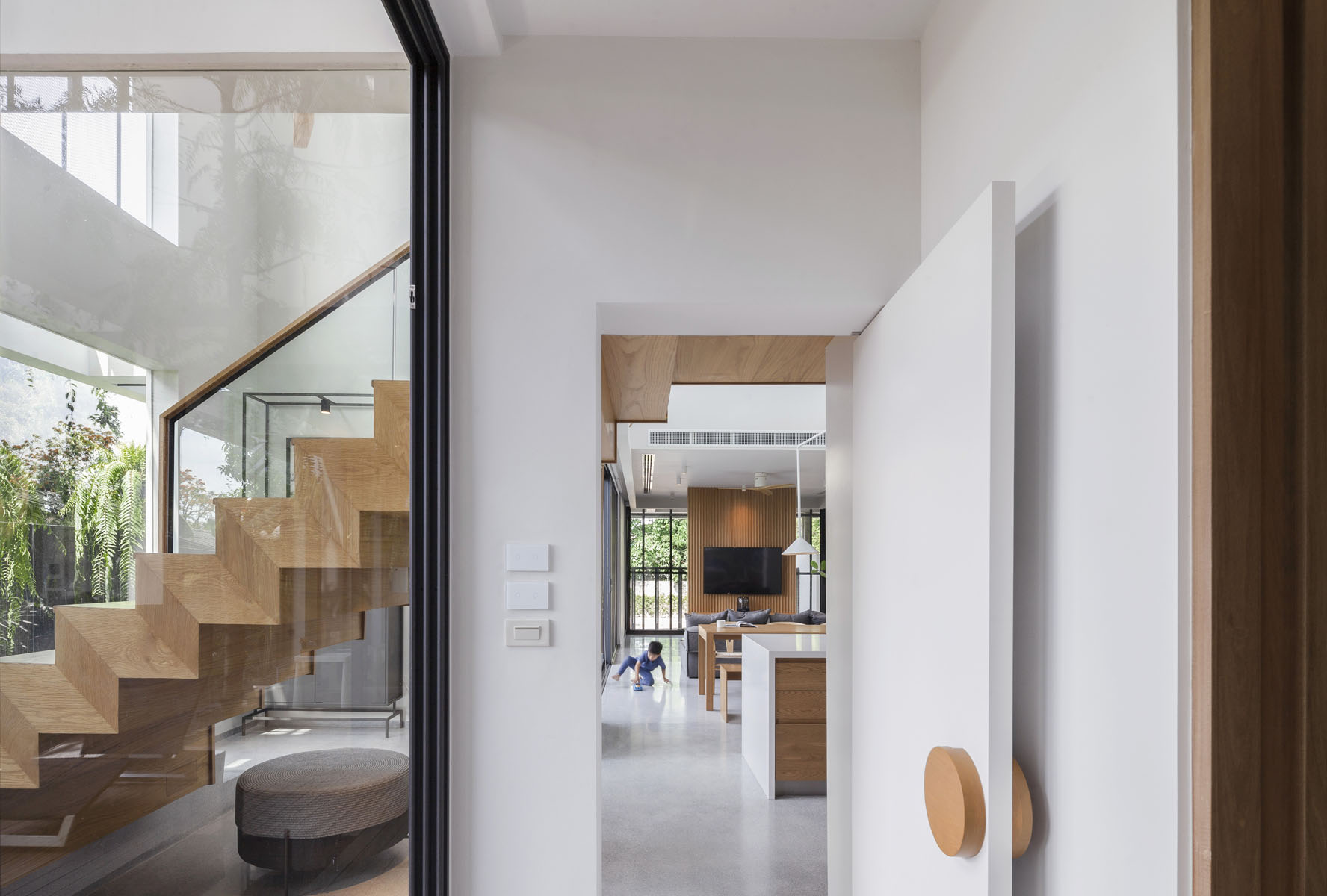 ถัดเข้ามาอีกหน่อย พื้นที่ด้านหลังของบ้านจะเป็นห้องครัว และห้องอเนกประสงค์ ซึ่งมีบันไดเป็นตัวคั่นกลางระหว่างสเปซ เติมบรรยากาศด้วยมุมพักผ่อนเล็กๆ อย่างเทอเรซล้อมรอบต้นโอ๊ค ที่พ่อ แม่ ลูกสามารถมานั่งพักผ่อน นั่งชมธรรมชาติร่วมกันได้ในระหว่างวัน เรือนยอดของต้นโอ๊คยังเป็นผลพลอยได้ ที่สร้างบรรยากาศ เติมความอบอุ่นให้กับห้องน้ำมาสเตอร์ที่บริเวณชั้นสอง แสงที่ส่องผ่านเรือนยอดเหล่านั้นยังสร้างความมีชีวิตชีวากับบ้าน นอกเหนือไปจากองค์ประกอบของงานสถาปัตยกรรมเพียงอย่างเดียว