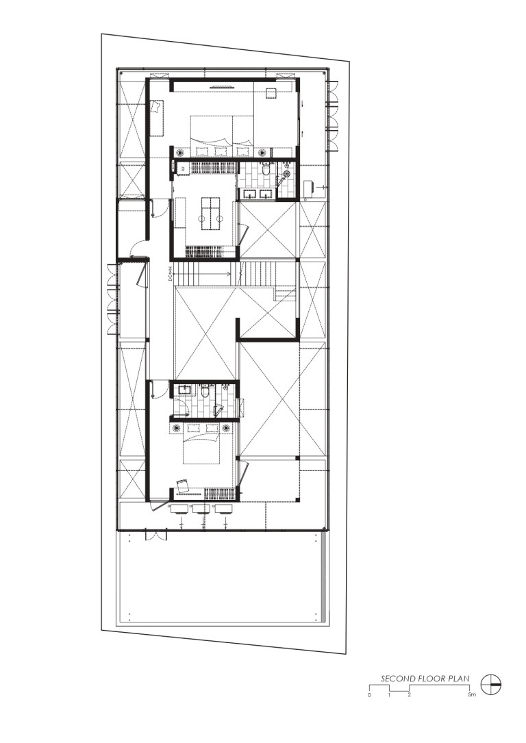 สำหรับชั้นสอง พื้นที่ถูกแบ่งออกเป็นสองปีกอย่างชัดเจน โดยปีกของมาสเตอร์จะอยู่บริเวณด้านหลัง ส่วนด้านหน้าซึ่งเชื่อมต่อกับด้านบนของที่จอดรถจะเป็นพื้นที่ของลูกชาย เผื่อสำหรับการต่อเติมเทอเรซส่วนตัวในอนาคตก็สามารถทำได้อย่างเป็นสัดส่วนและสะดวกสบาย