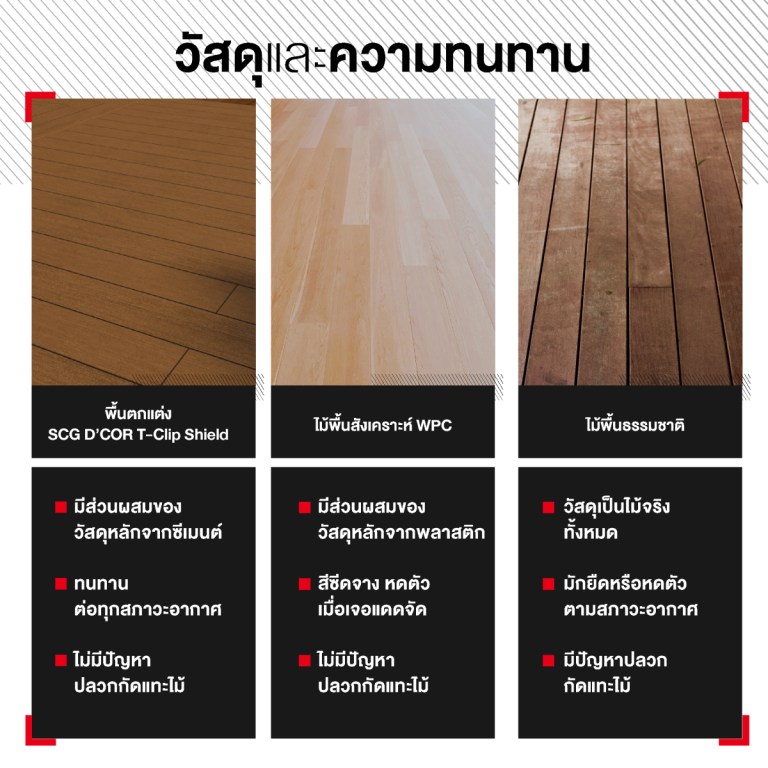ในขณะที่ไม้สังเคราะห์ WPC นั้น มีส่วนผสมของวัสดุหลักจากพลาสติก สีจึงซีดจาง และหดตัวเมื่อเจอแดดจัด แต่ SCG D’COR T-Clip Shield นั้นมีส่วนผสมของวัสดุหลักจากซีเมนต์ จึงทนทานต่อทุกสภาวะอากาศ และไม่มีปัญหาปลวกกัดแทะไม้