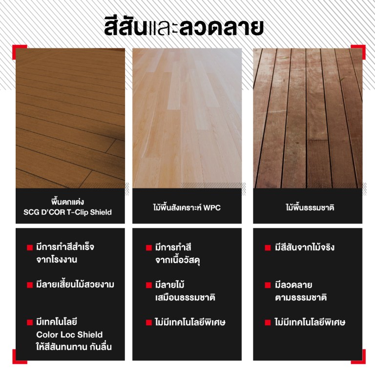 พื้นตกแต่ง เอสซีจี เดคคอร์ รุ่น ที-คลิปชิลด์และไม้ธรรมชาติเป็นวัสดุที่มีน้ำหนักมาก ในขณะที่ไม้สังเคราะห์ WPC จะมีน้ำหนักเบากว่า อย่างไรก็ตาม พื้นตกแต่ง เอสซีจี เดคคอร์ รุ่น ที-คลิปชิลด์ ได้ออกแบบมาโดยรองรับการติดตั้งใน 2 รูปแบบทั้งการติดตั้งแบบคลิปล็อค ที่เพิ่มความสะดวกสบายและสวยงาม เป็นทางเลือกที่นอกเหนือจากการยึดหัวสกรู ส่วนไม้จริงต้องติดตั้งแบบยึด