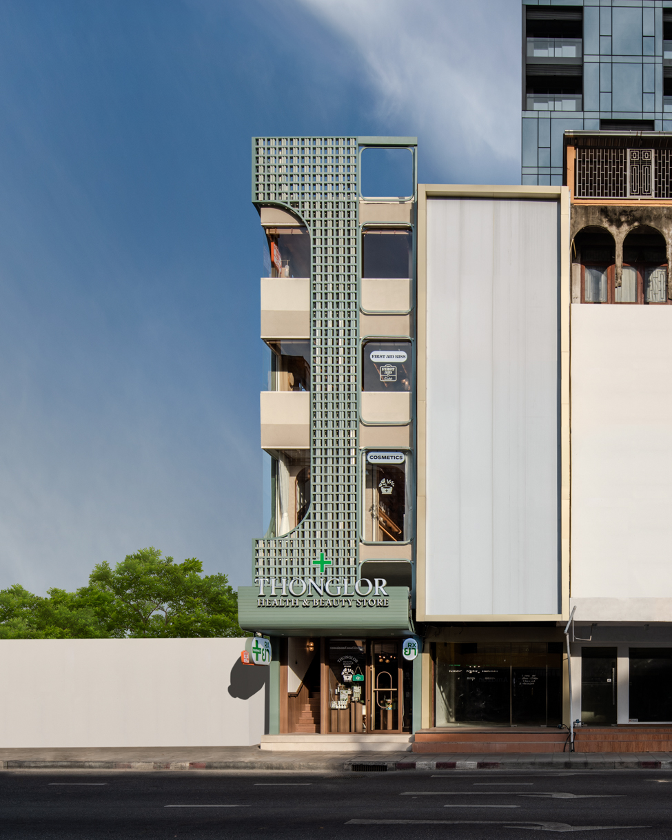 การออกแบบ facade ของอาคารแห่งนี้ แม้จะปรับรูปลักษณ์ใหม่ให้ดูทันสมัย แต่ยังคงภาษาความเป็นร้านขายยา โดยหยิบลักษณะเครื่องหมายบวกเข้ามาเล่นกับตัวอาคาร จนเกิดเป็นแพทเทิร์นลวดลายกราฟิกที่มีเครื่องหมายบวกซ่อนอยู่ภายใน ส่วนวัสดุที่เลือกใช้ เน้นใช้วัสดุธรรมชาติผสมกับแนวอินดัสเทรียล โดยเป็นอิฐผสมกับเหล็กกล่อง รวมถึงเลือกใช้สีเขียวเป็นหลัก ซึ่งเป็นสีที่แสดงออกถึงความเป็นร้านขายยา นอกจากเรื่องรูปลักษณ์ ยังเป็นเรื่องของมุมมองการมองเห็นของผู้คนที่สัญจรผ่านไปมา หากมองจากมุมเฉียงของตัวอาคารก็จะเห็นเป็นรูปแคปซูลเต็มวงนั่นเอง