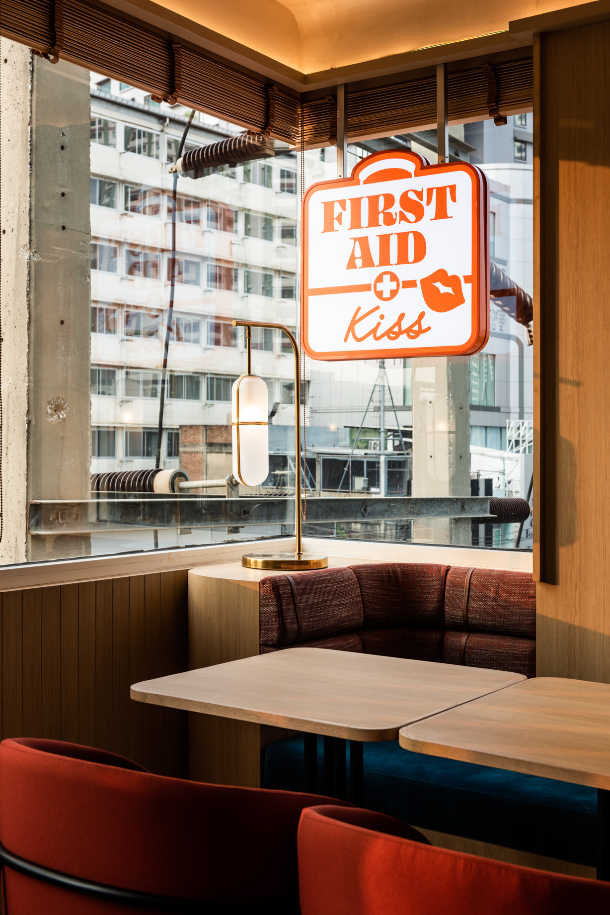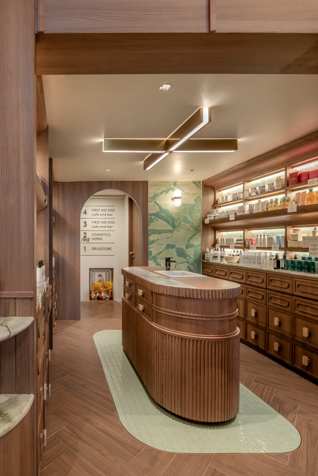 นี่คือไอเดียของโปรเจกต์ Thonglor Health & Beauty Store และ First Aid Kiss Cafe & Bar ของทีมผู้ออกแบบอย่าง AIM Imaginarist ที่ต้องการสร้าง vibe แห่งความสนุกสนานให้กับผู้ที่แวะเข้ามา โดยให้ความรู้สึกว่า ที่แห่งนี้เป็น everyday space ที่ไม่จำเป็นต้องมาเฉพาะแค่วันที่รู้สึกป่วย แต่ทุกคนสามารถมาใช้บริการพื้นที่ร้านขายยานี้ได้ในทุกวัน