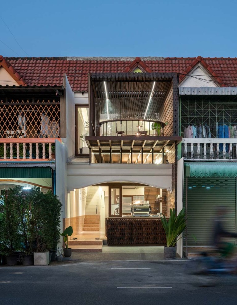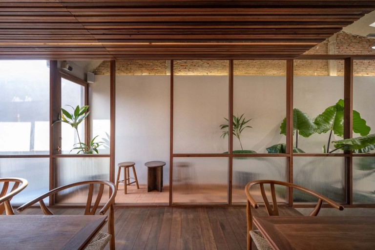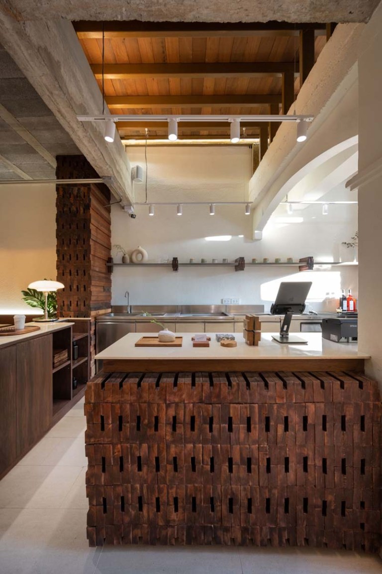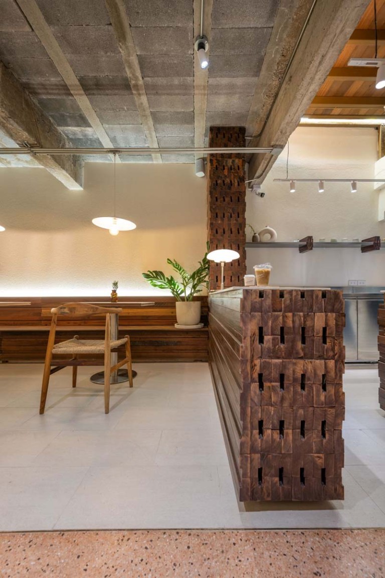 “เราไปเจอวงกบไม้วางกองเรียงกันอยู่ในตลาดในอยุธยา ซึ่งเป็นวัสดุที่หาได้ง่ายในท้องถิ่นมีหลายขนาดและรูปแบบ เราสังเกตเห็นว่าหน้าตัดของมันมี Pattern ที่น่าสนใจ เลยอยากทดลองนำมาออกแบบในรูปแบบใหม่กับอาคาร” สถาปนิกเริ่มเล่าที่ไปที่มาของชิ้นส่วนแรกของบ้านที่จะนำมาถ่ายทอดในการรีโนเวทครั้งนี้ นั่นคือ “วงกบไม้” ซึ่งแน่นอนว่าความพิเศษในการนำรูปตัดและรูปด้านของวงกบที่เกิดจากการเรียงต่อกันอย่างไม่ได้ตั้งใจ มาถ่ายทอดส่วนต่างๆ ของอาคาร ไม่ว่าจะเป็นผนัง พื้น ฝ้า เคาท์เตอร์ ชั้นวางของ หรือเฟอร์นิเจอร์ โดยวิธีการในการประกอบชิ้นส่วนเหล่านี้ถูกคิดให้สื่อสารกับช่างพื้นถิ่น และในระหว่างการก่อสร้างสถาปนิกเลือกที่จะเก็บลวดลายและผิวสัมผัสของหน้าตัดวงกบไม้ที่เกิดจากใบเลื่อยวงเดือนไว้ให้ได้มากที่สุด เพราะเป็นภาษาที่เกิดขึ้นร่วมกันระหว่างสถาปนิกและช่างที่มีความเรียบง่ายไม่ซับซ้อน
