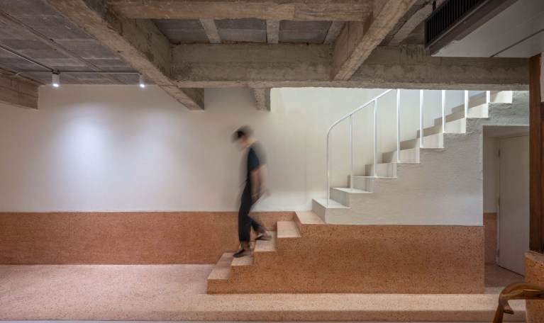 รอยต่อระหว่างวัสดุของผนังด้านซ้าย เป็นอีกหนึ่งส่วนที่คอนทราสกันอย่างเห็นได้ชัด ตั้งแต่พื้นและกำแพงด้านหน้าไปจนถึงบันไดที่ถูกเปลี่ยนทิศทางใหม่ให้เหมาะกับฟังก์ชันของคาเฟ่มากขึ้น โดยวัสดุครึ่งล่าง คือเทอรอสโซ่สีส้มอ่อน ซึ่งเป็นวัสดุที่เห็นได้ทั่วไปตามบ้านทาวเฮาส์เก่า ให้ความรู้สึกอบอุ่นและเป็นวัสดุที่คุ้นเคยกับคนไทยมานาน ส่วนผนังครึ่งบนผนังปูนสีขาวฉาบเรียบธรรมดา แต่เมื่อตัดกับวัสดุปูนที่ไม่ผ่านการขัดและทำสีของคานและพื้นชั้นสองเดิม ก็ยิ่งเห็นได้ชัดเจนว่ารอยต่อระหว่างวัสดุนี้ทำให้เกิดเส้นสายทางสถาปัตยกรรมในทุกทิศทาง ถึงแม้จะดูเรียบง่ายแต่ก็สร้างมิติให้กับทาวน์เฮาส์หนึ่งคูหาได้อย่างน่าสนใจเลยทีเดียว