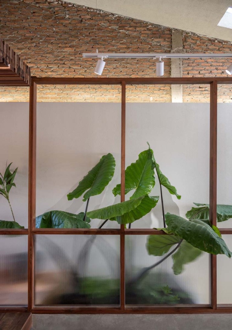อีกหนึ่งร่องรอยอาคารเก่าที่ถูกเก็บไว้ คือ ผนังอิฐที่อยู่ใต้หลังคา ซึ่งเกิดจากความบังเอิญเจอในระหว่างการรื้อถอนฝ้าเดิมออกเพื่อเพิ่มความโปร่งโล่งให้กับพื้นที่ สถาปนิกจึงเก็บผนังเก่าส่วนนี้ไว้และผสมผสานเข้ากับการออกแบบใหม่ เพิ่มพื้นที่ปลูกต้นไม้ภายใน พร้อมเปิดช่องแสงด้านบนให้บรรยากาศเป็นไปอย่างอบอุ่นแบบที่ตั้งใจไว้