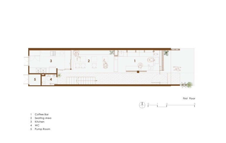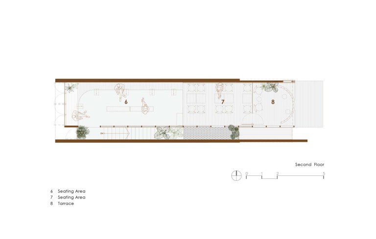 ที่นั่งภายในชั้น 2 ถูกแบ่งออกเป็นสามส่วน ส่วนด้านหน้าบนระเบียง ด้านข้าง และส่วนด้านหลังที่มีที่นั่ง Built-in ติดกำแพง มีความสูงในระดับเดียวกับระเบียงที่ถูกยกขึ้น เพื่อให้เส้นสายการออกแบบเป็นไปในทิศทางเดียวกัน โดยเฟอร์นิเจอร์ลอยตัวภายในร้าน ส่วนใหญ่เป็นเฟอร์นิเจอร์ไม้แบบ custom made