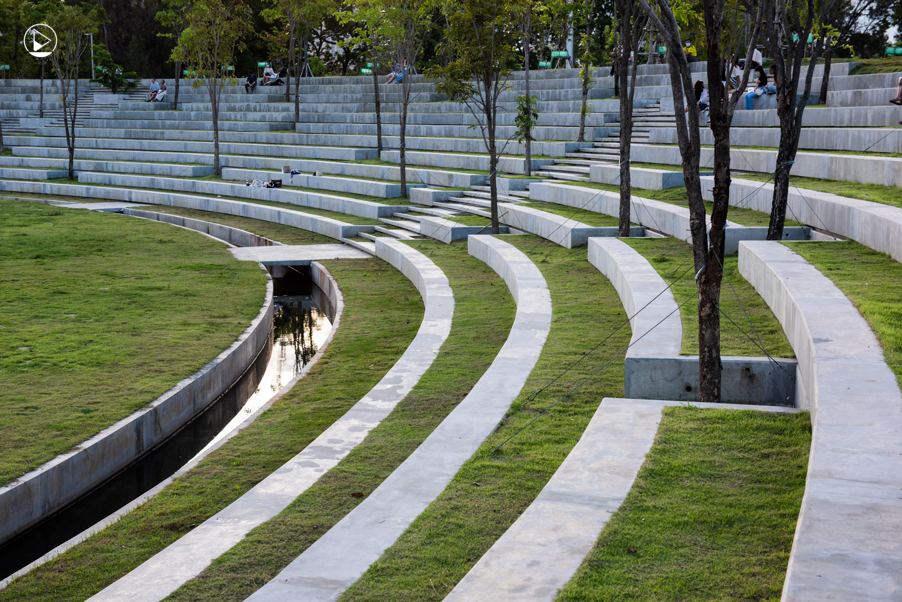 “สวนแห่งนี้ในแง่ของการเป็นสวนสาธารณะ ยังคงต้องทำหน้าที่ได้อย่างไม่ขาดตกบกพร่อง การมีพื้นที่กิจกรรมของคน ของเมืองจึงยังเป็นสิ่งจำเป็นและสำคัญ สวนจึงมีพื้นที่โซนเปิดโล่งสำหรับรองรับกิจกรรม ถูกออกแบบให้เป็นอัฒจันทร์ขนาดใหญ่ และสนามหญ้าสำหรับรองรับคนจำนวนมากเพื่อจัดงานในเทศกาลต่างๆ นอกจากนี้พื้นที่สนามหญ้ายังเป็นพื้นที่สำหรับรองรับน้ำในฤดูฝนที่มาจากโดยรอบพื้นที่ของสวนสาธารณะแห่งนี้”