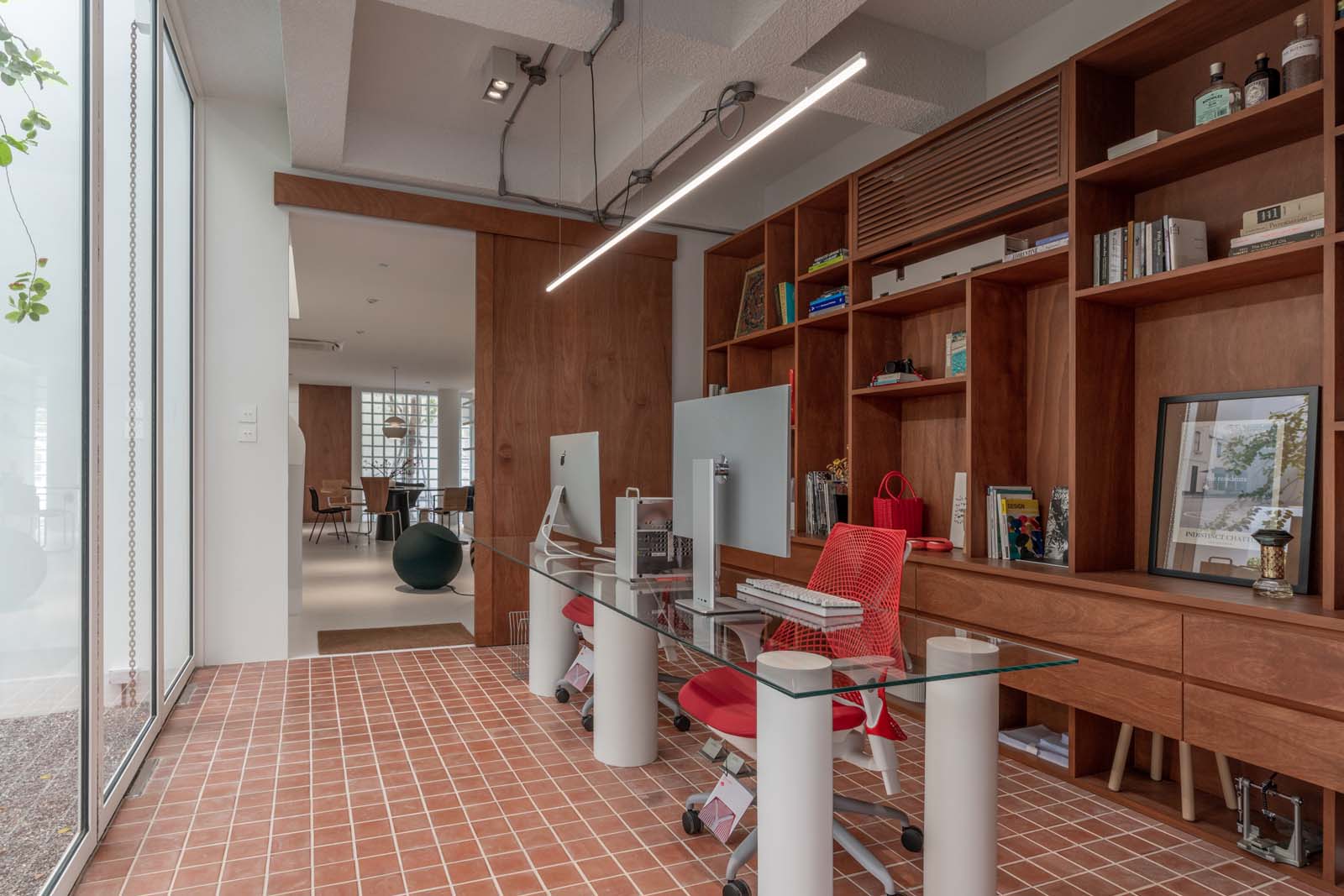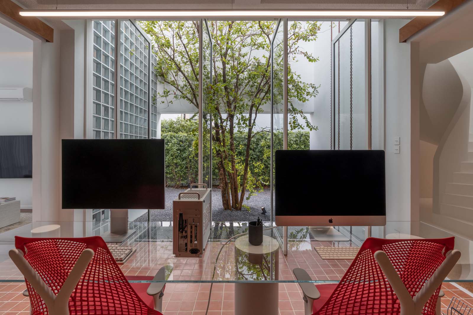 ถัดจากบันไดวน หากเราไม่ขึ้นชั้นสอง จะเจอกับห้องทำงานซึ่งดีไซน์เป็นโต๊ะสองที่นั่ง ซึ่งสามารถมองออกไปเห็นต้นไม้ และมีกระจกบานเปิดที่สามารถเลือกเปิด-ปิด พร้อมรับลมในวันอากาศดี ถัดไปยังห้องสุดท้าย เป็น Living Space ซึ่งความพิเศษอยู่ที่การดีไซน์ Sofa Island วางที่ใจกลางห้อง และมีระนาบผนังของห้องที่ไม่เหมือนกัน เพื่อให้ได้บรรยากาศที่แตกต่าง และสร้างมุมมองได้หลายทิศทาง ด้านหนึ่งเป็นผนังทึบสำหรับทีวี ด้านถัดมาเป็นผนังของทำงาน ซึ่งออกแบบให้เป็นบล็อกแก้วที่กรองแสงและยังเห็นต้นไม้เลือนราง เพื่อให้พื้นที่ยังมีความอ่อนโยนและไม่แข็งจนเกินไป ส่วนผนังอีกด้านจะเป็นที่นั่งริมหน้าต่างสำหรับอ่านหนังสือ ชมวิวพักสายตา
