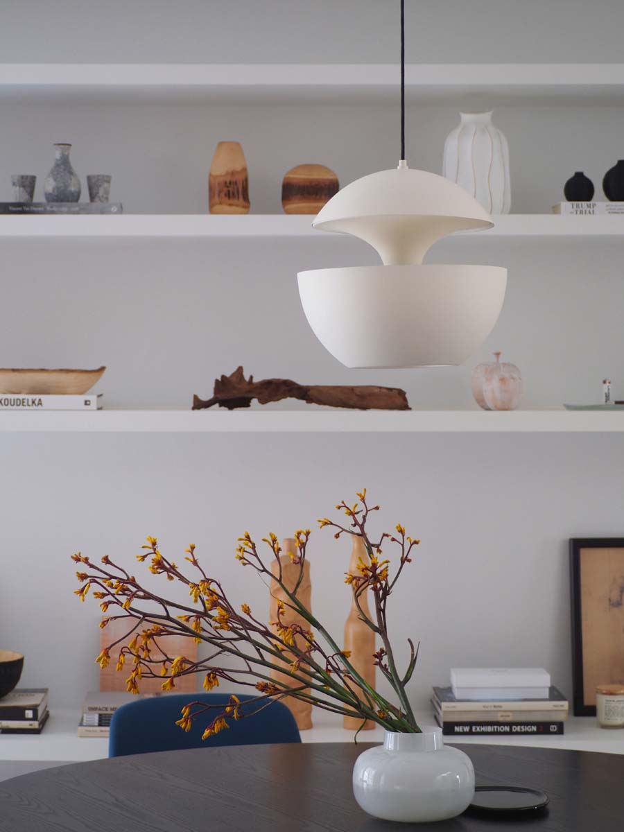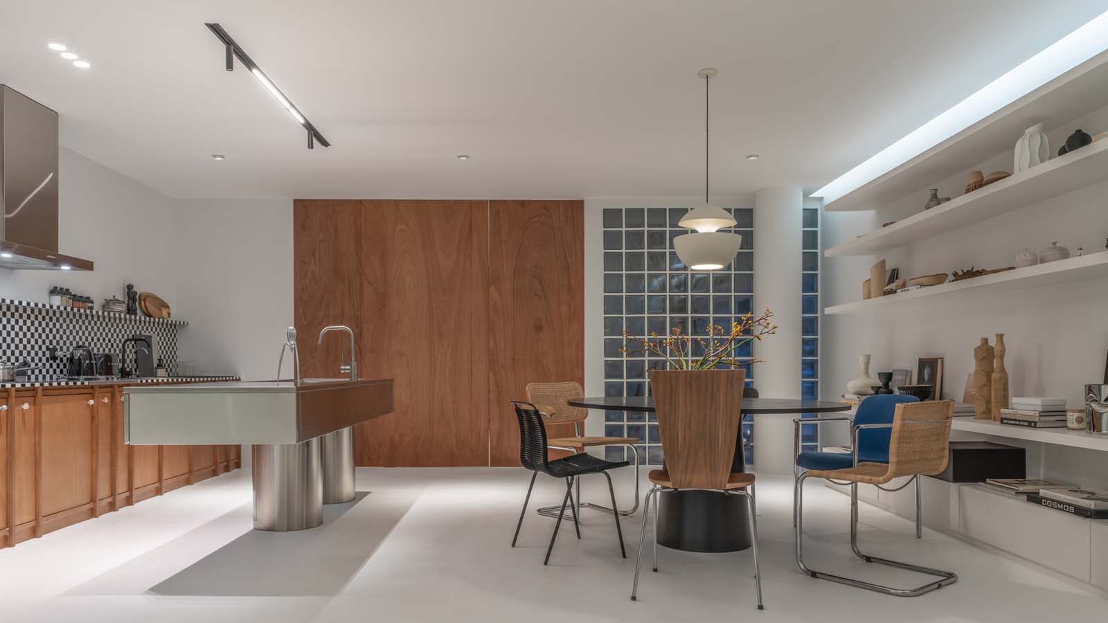 ด้วยความที่คุณเอเป็นอินทีเรียดีไซน์ ส่วนคุณกาญจน์เป็นโปรดักต์ดีไซน์เนอร์ ของใช้ในบ้านแต่ชิ้นจึงผ่านการเลือกสรร และเป็นของสะสมที่ทั้งคู่รัก สิ่งต่าง ๆ ที่นำมาตกแต่งจึงเป็นไอคอนิกในกลิ่นอาย Mid Century Modern ที่ส่งเสริมให้สเปซ ที่ว่างสวยงามลงตัวไปพร้อม ๆ กัน อย่างเช่น ครัว Pantry หรือ Dining Area เองที่ออกแบบตามการใช้งานของทั้งคู่ โดยครัวจะประกอบไปด้วยตู้เคาน์เตอร์ไม้ที่ออกแบบให้เป็นท็อปลายหมากรุกเพื่อให้ได้กลิ่นอายของงานคราฟต์แบบศิลปะ และยังมีครัวไอซ์แลนด์ขนาดใหญ่อยู่บริเวณใจกลางตามไลฟ์สไตล์และการใช้งาน ส่วนพื้นที่นั่งรับประทานอาหารมี 5 ที่นั่ง ดิสเพลย์ด้วยชั้นวางของและ Sculpture ที่ทั้งคุณเอและคุณกาญจน์สะสมไว้ รวมถึงเฟอร์นิเจอร์เก้าอี้ที่ไม่ซ้ำแบบกันเลยสักตัว