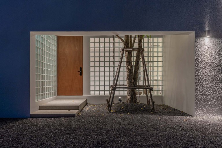 “ทางเข้าหน้าบ้านหลักจะมีต้นไม้หนึ่งต้น อีกต้นจะอยู่ที่ห้องทำงาน เนื่องจากแปลนมันเป็นตัว U ครอบต้นไม้ ทำให้มันจะเห็นสองต้นนี้จากทุกมุม ไม่ว่าจะอยู่ชั้นหนึ่งหรือชั้นสอง นั่นคือแนวคิดที่เราตั้งใช้ต้นไม้จำนวนน้อยที่มีอยู่ ให้ได้เยอะที่สุดในการมองเห็น” คุณเอเล่า