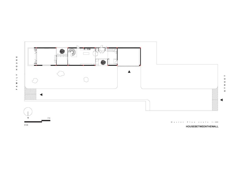ด้วยบริบทของพื้นที่ซึ่งตั้งอยู่บนที่ดินของครอบครัวในลักษณะสี่เหลี่ยมผืนผ้าขนาด 324 ตารางวาที่ยาวถึง 80 เมตร รวมถึงมีถนนกว้าง 4 เมตรตัดผ่านเข้าไปถึงบ้านของครอบครัว ทำให้สองนักออกแบบจำเป็นต้องล่นระยะการวาง Planning เข้าไปอีก บ้านจึงเลี่ยงไม่ได้ที่จะอยู่ในลักษณะรูปทรงสี่เหลี่ยมผืนผ้ายาวขนานไปกับที่ดิน เมื่อมีข้อจำกัดดังนั้น ผู้ออกแบบจึงเลือกใช้ผนังกว้าง 6 เมตรเพียงสแปนเดียวในการออกแบบบ้านหลังนี้ ทำให้ตัวบ้านและเรื่องราวของการอยู่อาศัยถูกซ่อนเอาไว้ภายในเส้นยาวระหว่างกำแพงทั้งหมด เป็นที่มาของชื่อบ้าน House Between the Wall