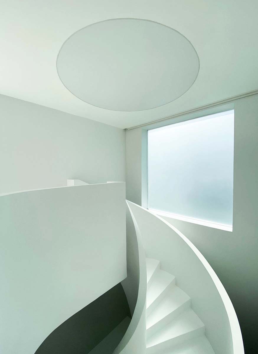 ไม่ใกล้ไม่ไกล เป็น Spiral Staircase หรือบันไดวนขึ้นสู่ห้องมาสเตอร์เบดรูม ซึ่งเป็นโครงสร้างสีขาวที่สองดีไซน์เนอร์ตั้งใจให้เป็นไฮท์ไลท์ของบ้าน ประกอบกับมีอาร์มแชร์จาก B&B Italia’s Iconic UP Celebrates 50 Years เอาไว้เป็นกิมมิกสำหรับแวะนั่งเล่น นั่งพักและยังเติมเต็มให้พื้นที่นี้ดูสมบูรณ์มากยิ่งขึ้น ด้วยของตกแต่งดีไซน์และแฟชั่นที่ทั้งคู่ต่างหลงใหล และสะสม ลักษณะงานดีไซน์ อินทีเรียของบ้าน จึงถูกออกแบบให้คล้ายกับแกลลอรี่โชว์ศิลปะ ผ่านการออกแบบระนาบทางสถาปัตยกรรมให้เรียบง่าย มินิมอลที่สุด รวมถึงการออกแบบแสงสว่างที่ส่องไปยังตัววัตถุที่ต้องการสื่อสารโดยตรง ต่างจากบ้านทั่ว ๆ ไป ที่วางตามกริดไลน์ในแบบกระจายตัว