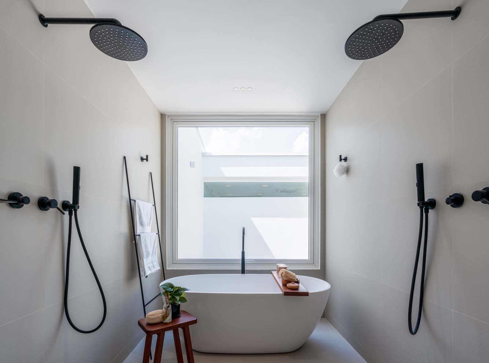 “ตอนที่เราออกแบบภายในและภายนอก เราคิดพร้อมกันเลยตั้งแต่แรก อย่างเช่นห้องน้ำ เราเจอปัญหาตอนอยู่คอนโดที่ต้องแย่งกันใช้ เดินชนกัน เราเลยจัดห้องน้ำให้เป็นทางเดินซ้ายขวา แยกกัน มีฝักบัวแบบ His and Her ที่สามารถใช้พร้อมกันได้ บ้านหลังนี้ออกแบบเพื่อแก้จากประสบการณ์การอยู่อาศัยที่เราเคยพบเจอมาให้ได้ฟังชั่นที่เหมาะสมทั้งภายในและภายนอก” คุณกาญจน์ เล่า